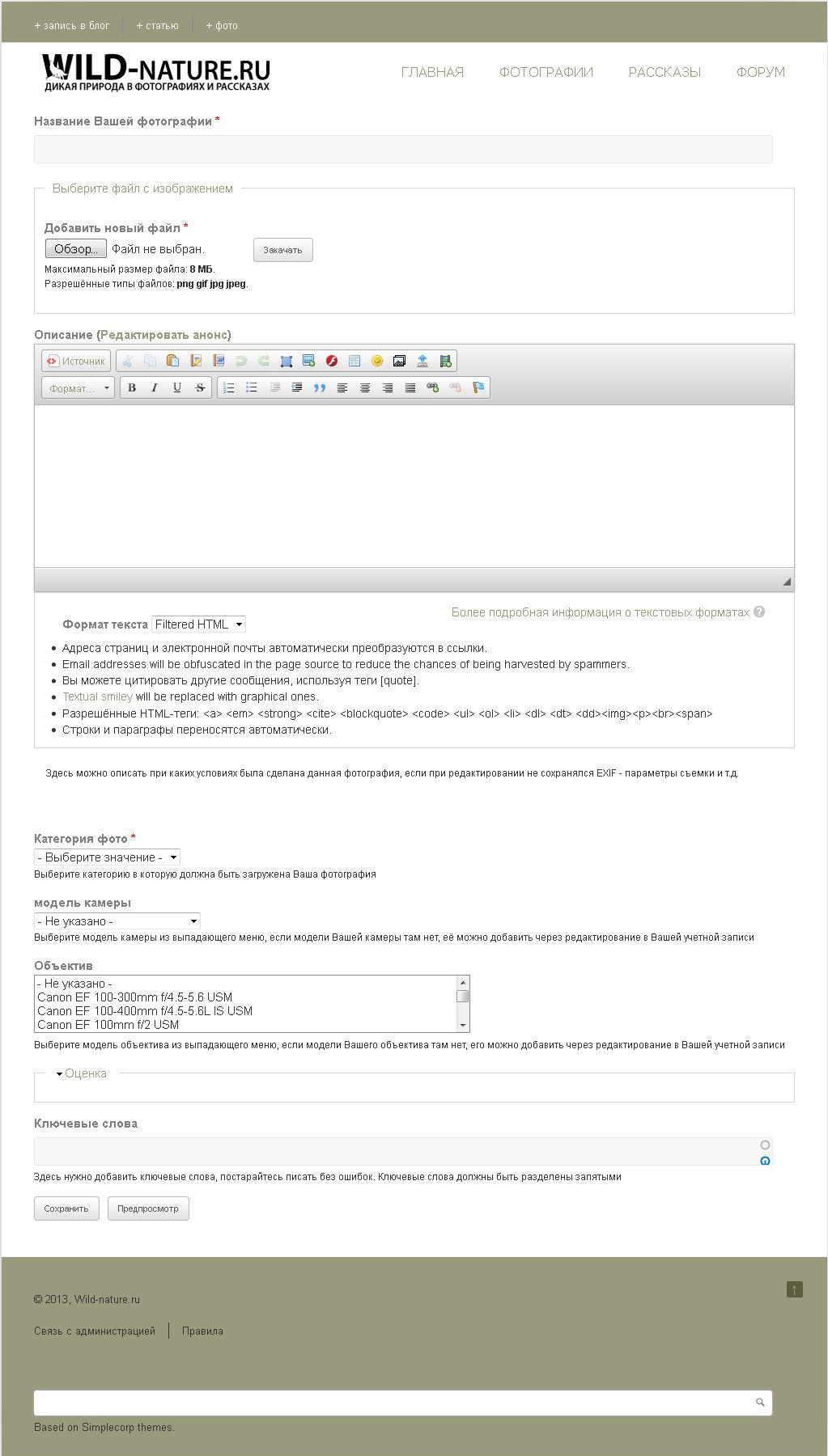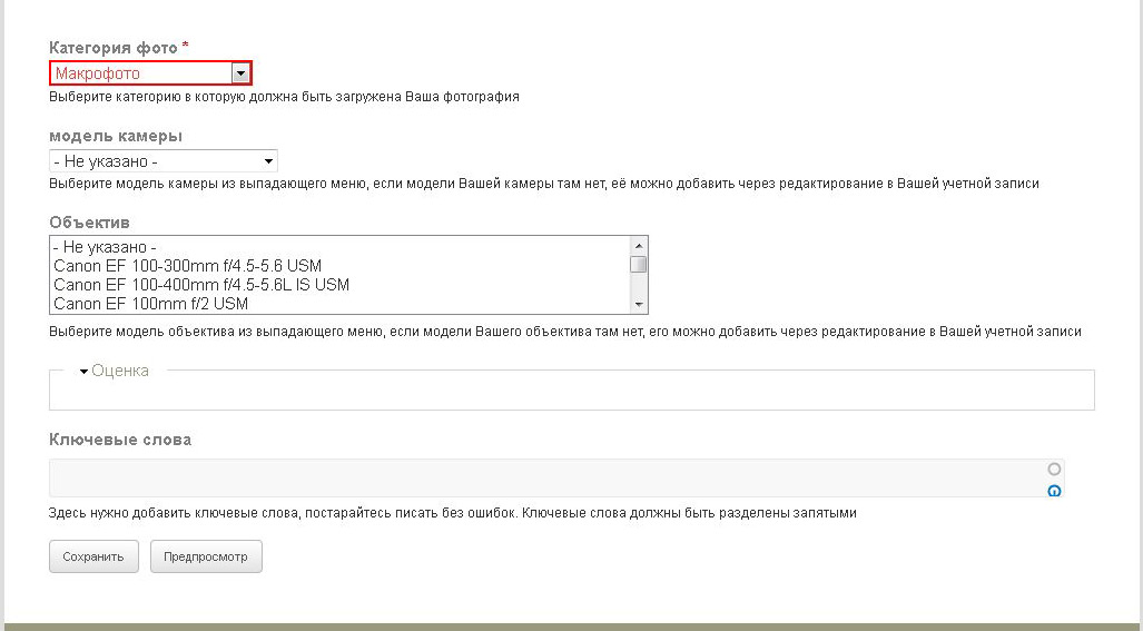Очень желательно заполнять поле "Ключевые слова", для облегчения поиска похожих фотографий по сайту.