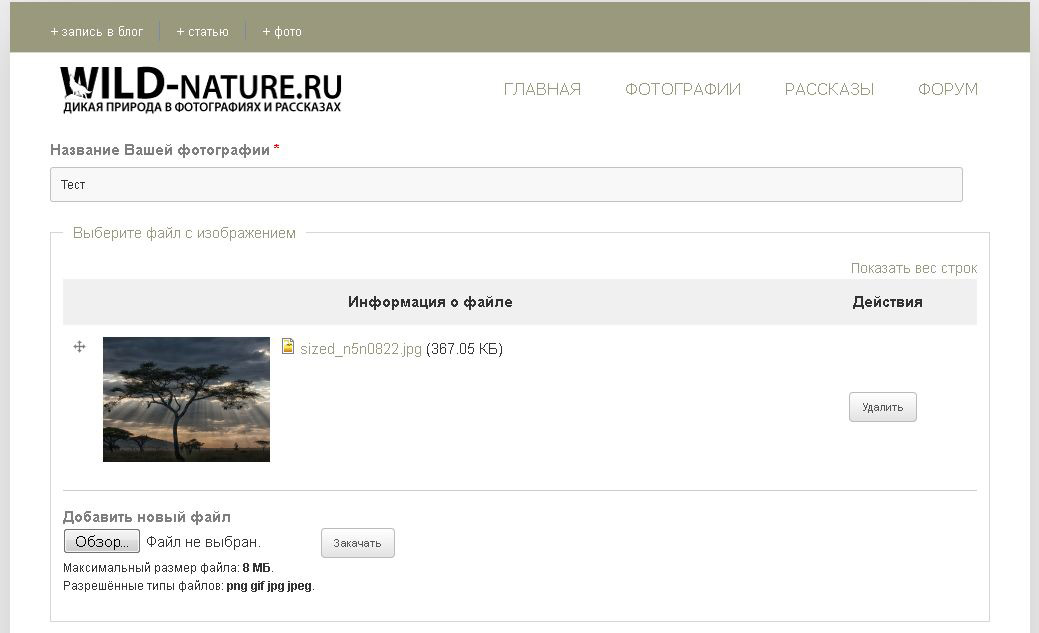 После выбора файла нажимаем кнопку закачать. После закачки фотография появляется в окне: