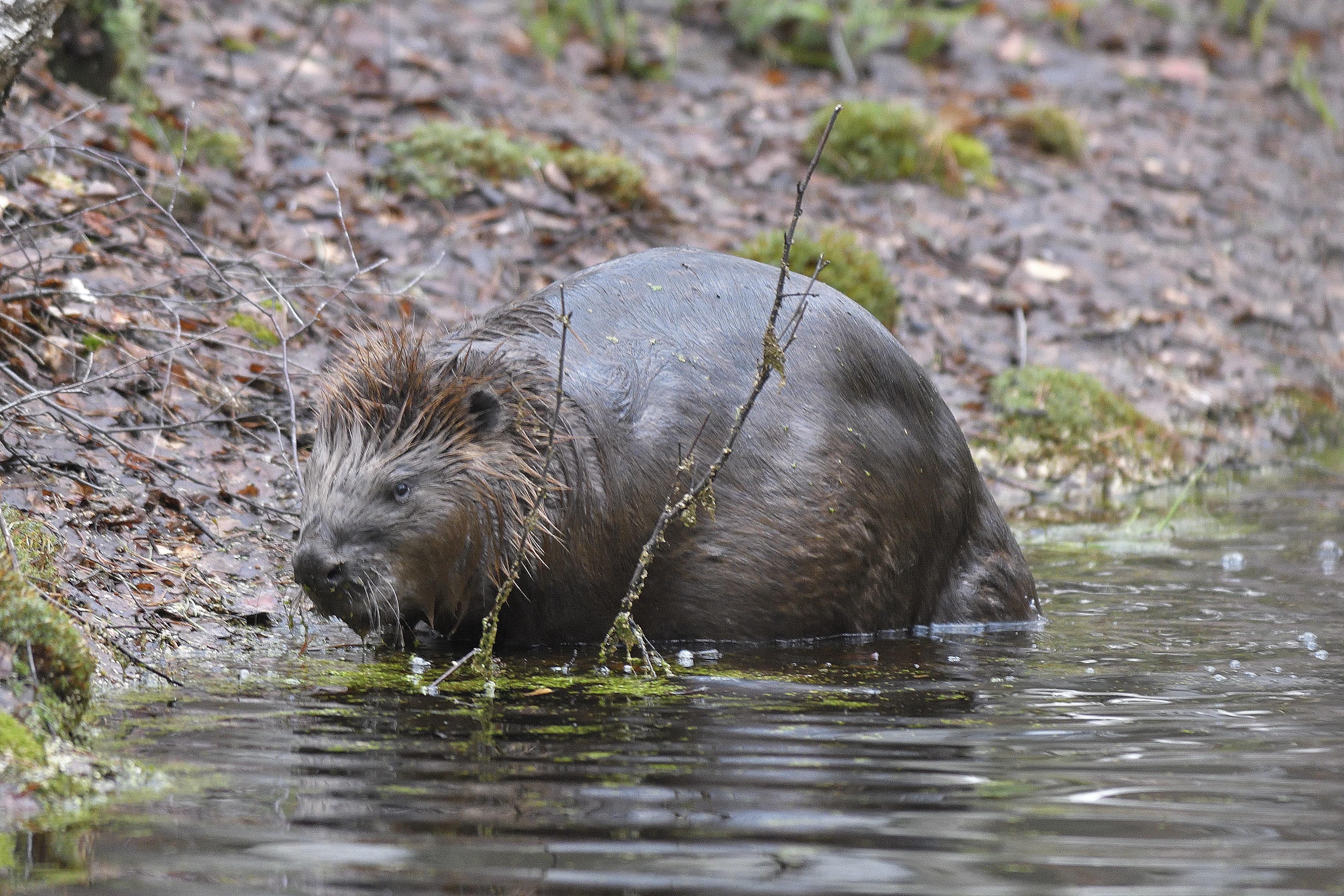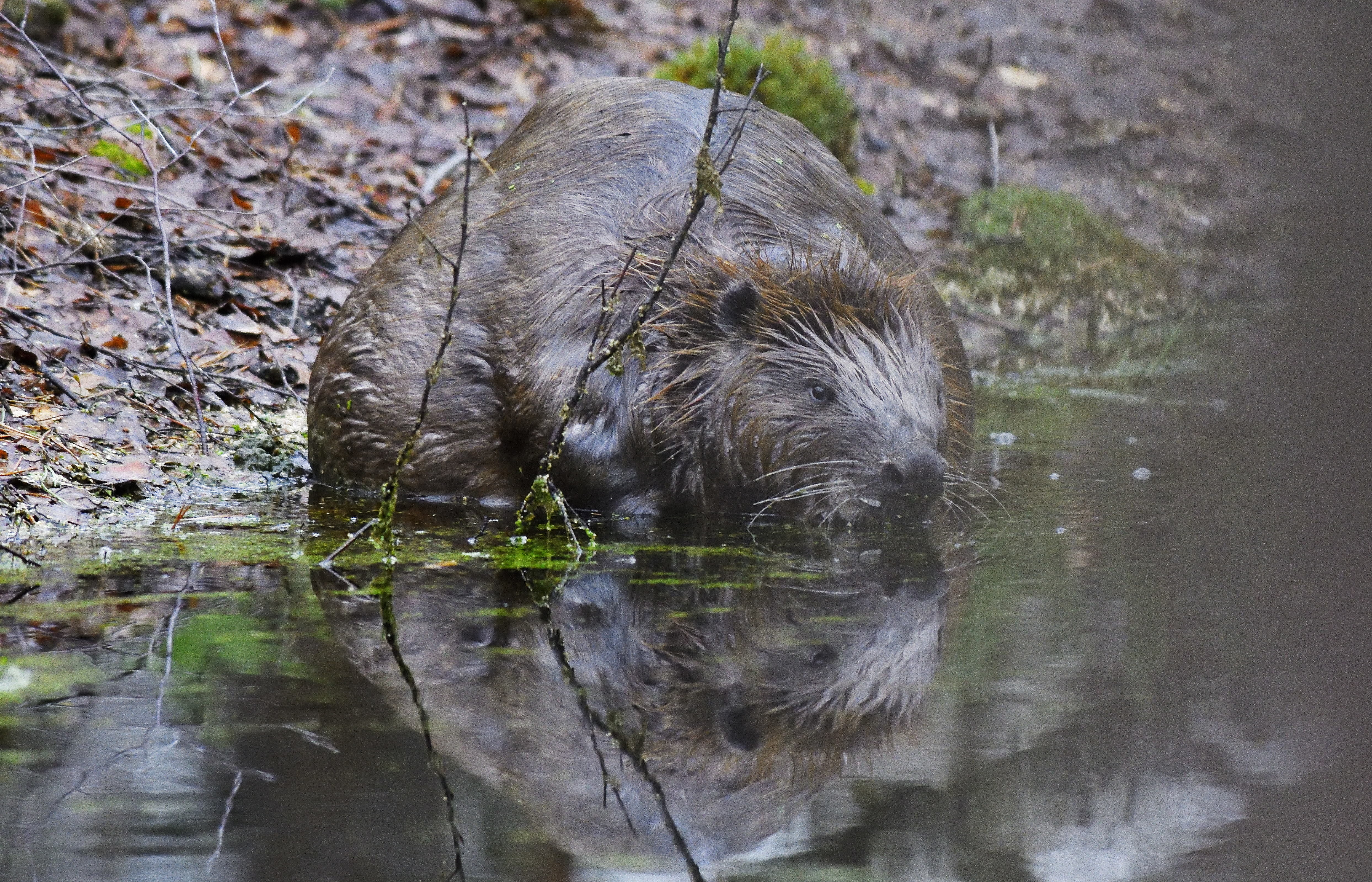 Иду себе мирно никого не трогаю, даже не снимаю по краю водоотводной канавы на Блудовом болоте. Дело было по весне. И вдруг проваливаюсь ногой в подземный бобровый ход. Упомянув некоторые известные выражения, вытащил сапог и уже пошел дальше... Но тут вижу на воде "след торпеды". Это пузырьки воздуха, только образуются они когда зверь ныряет в воду и пузырьки воздуха из шерсти всплывают вверх. И вот всплывает и сама "торпеда". Сначала решил что там два бобра, но когда он (а скорее она) выбралась на противоположный берег, не сразу понял что это бобр- очень уж здоров он был, да еще эта рыжая грива. А зверь посидел спокойно и нырныл обратно, видимо я провалился именно в тот ход, где он и отдыхал.