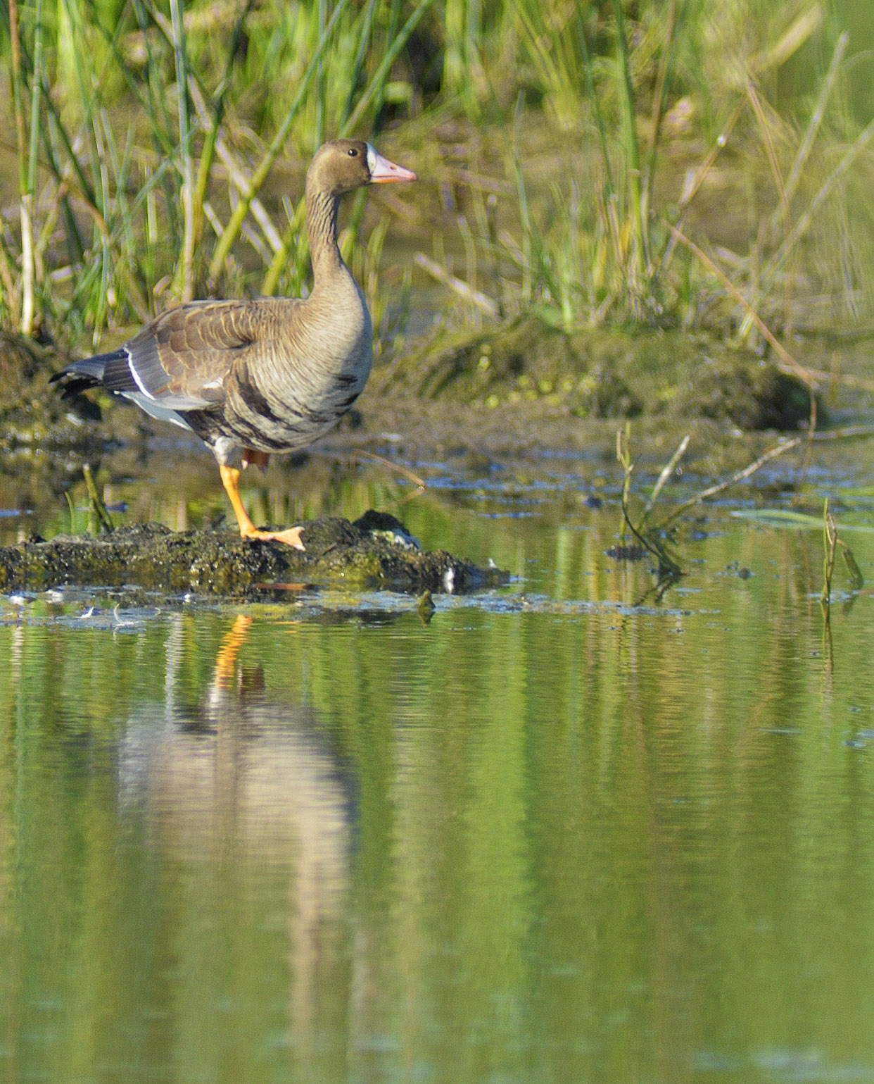Судя по всему - белолобый гусь, непонятно как он оказался во Владимирской области, похоже подранок, может остался с весенней охоты, видел меня но не улетел. а потоптавшись, слетел на воду и уплыл.