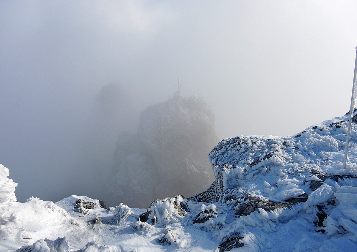 Крест видно, но поскольку на уровне вершины стояло облако, то видно его только в разрывах. А панцыри не ветром выточило, это последствие ледяного дождя.