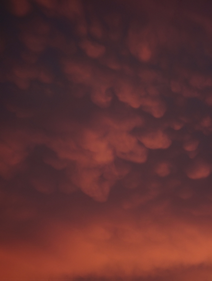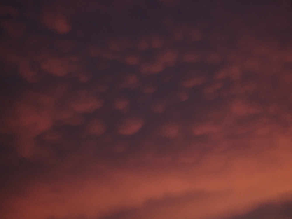 Мамматус (вымеобразные или трубчатые облака) - редкий тип облаков, встречающийся преимущественно в тропических широтах. Возникают при наползании более плотного воздуха на слой менее плотного, при взаимопроникновении слоев (верхний слой как бы тонет в нижнем) формируются характерные структуры, время жизни которых весьма невелико. В данном случае облака мамматус "прожили" не более 15 минут, находясь в непрерывном движении. Этот случай - первое мое наблюдение таких облаков. К сожалению, снимать пришлось на мыльницу из окна движущейся маршрутки, но что ж поделать - выбирать не пришлось.
