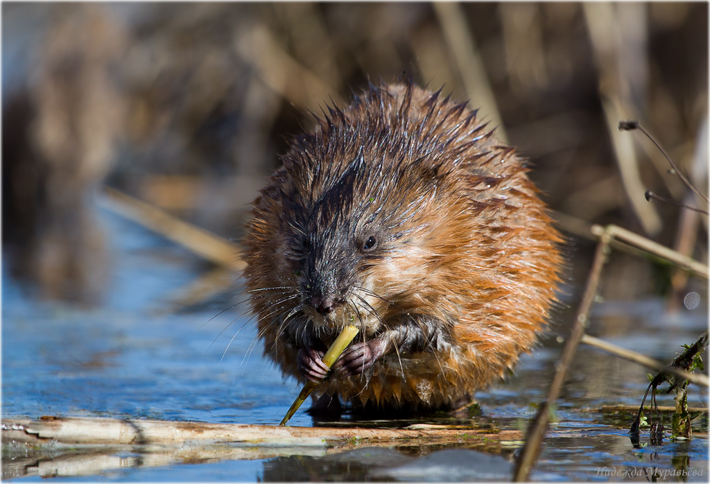 Вчера напялила забродники полезла в болото.  И не пожалела: прямо перед носом вылезла нутрия: сначала испугалась и нырнула, потом, видимо, решила, что нормальный человек в разлив в болото никак не может забрести, и вышла снова. Дала сделать несколько кадров. Жаль, что не на рассвете и не в контровом. Нет в этом мире совершенства!