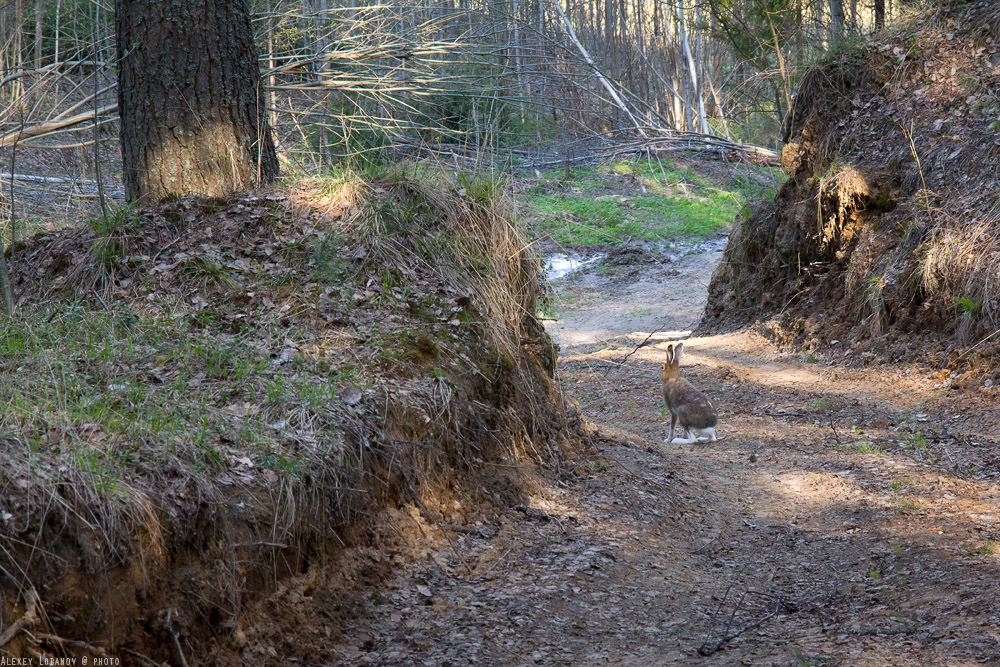 Да тоже не панацея, как оказалось:) Через минут 15 и через метров 100 я остановился у места, где мы обычно ставим машину, когда ходим за грибами. Там елочки. Рассматривал, как лес тактором по осени расковыряли в округе. Слышу топот, реально, отчетливо так. Поворачиваюсь - скорее всего этот же самый заяц выбегает прямо на меня. Метра 3 до него. Тень. Направил на него 200ку)) (вот тут то 70 мне бы хватило:)) Но увы, он меня сразу заметил и убежал в обратную сторону, в чащу.