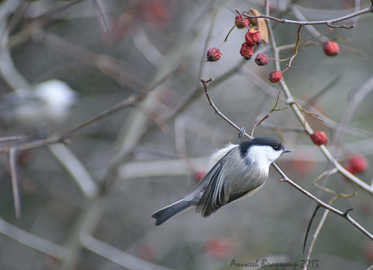 Пухляки прилетев на голос в зарослях боярышника, как ни странно начали клевать ягоды...