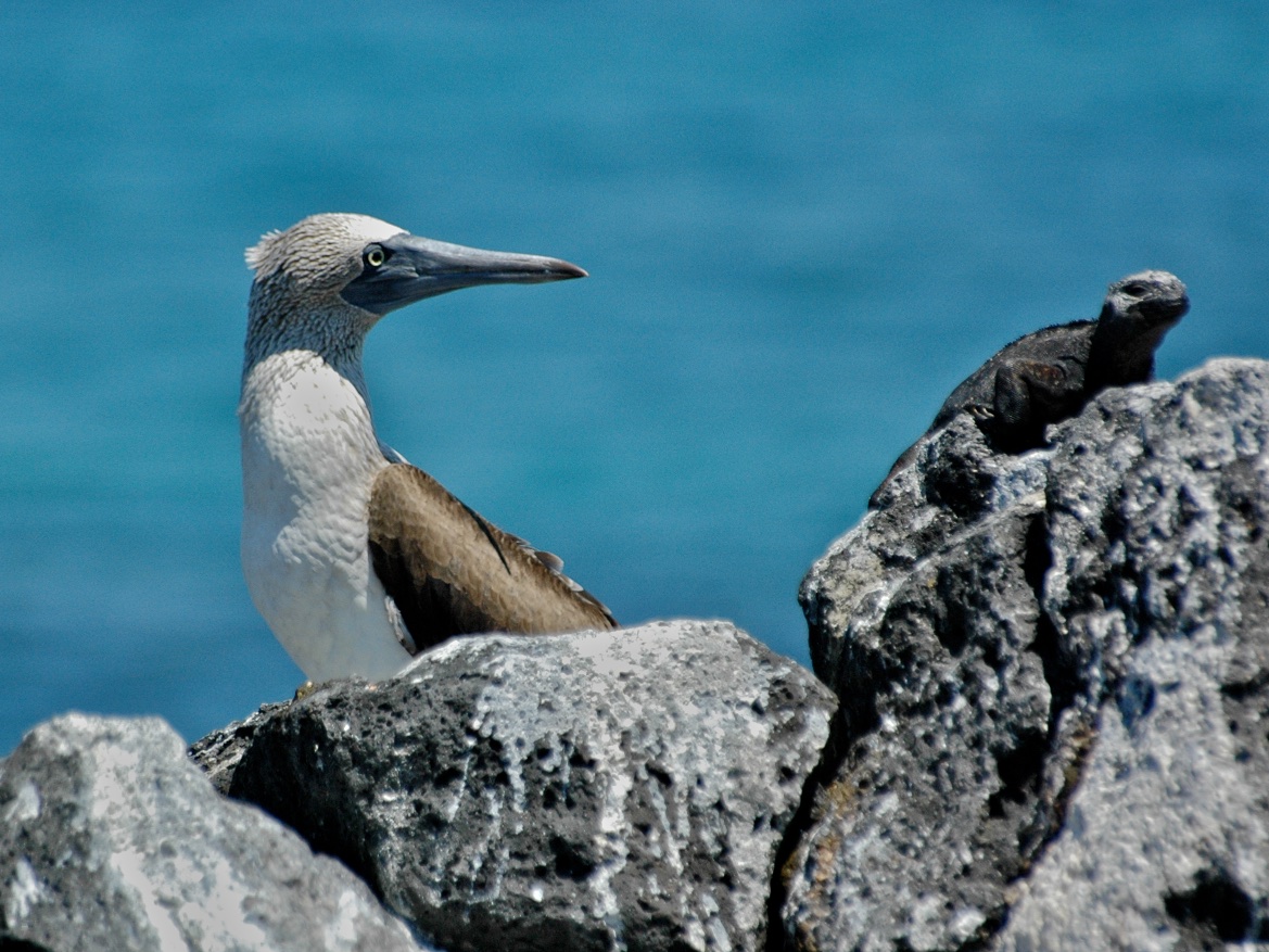 Плавательные перепонки и сами ноги у нее имеют синий цвет, за что эта птица и получила свое название, но на снимке это запечатлить не удалось, мешал камень, зато морская игуана присутствует :-)