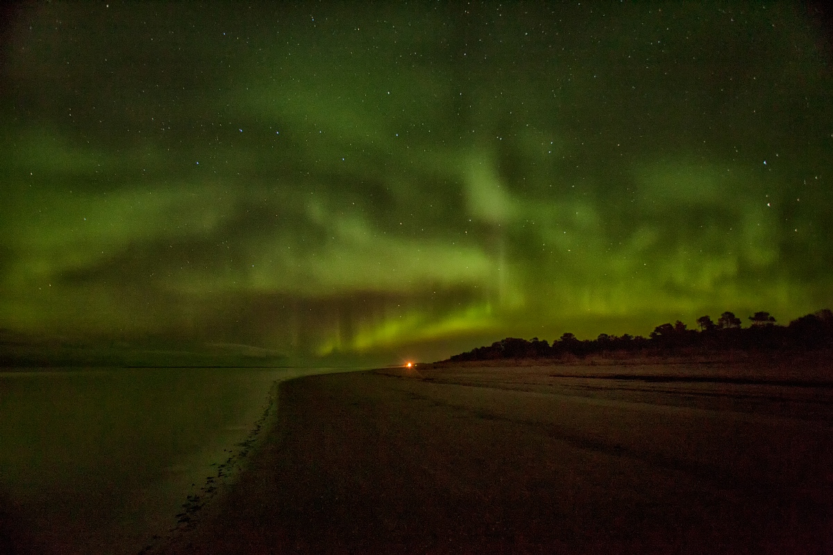 Северное сияние над белым морем. Северодвинск, о. Ягры