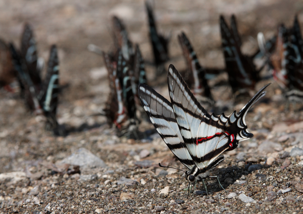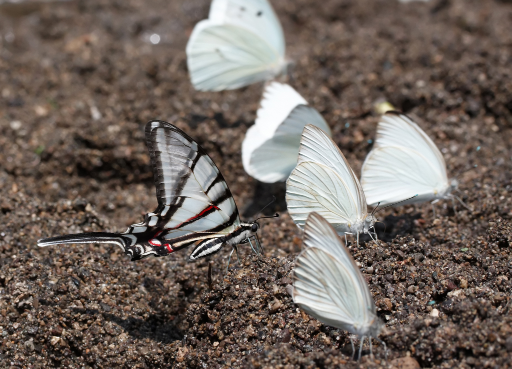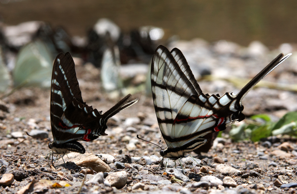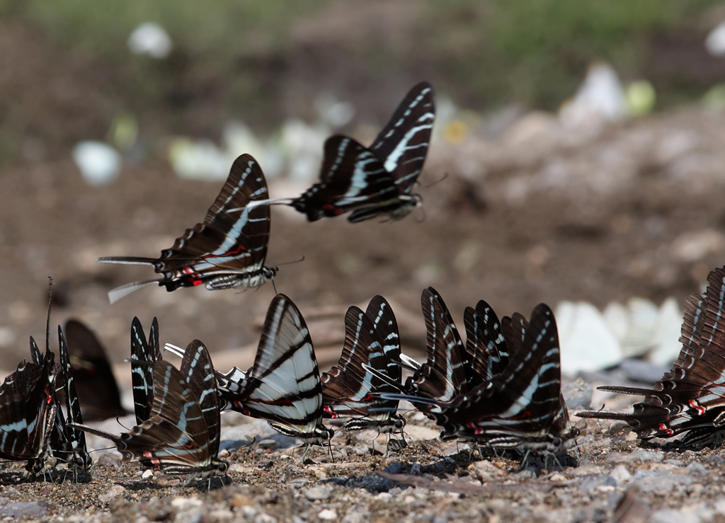 На отдельных участках скапливаются сотни чёрных и белых подалириев (Protographium philolaus и P. epidaus). Парусники сидят практически друг на друге, пьют и выделяют влагу, пихаются, вспархивают- шорох крыльев слышен за несколько метров. Настоящая свалка, и фотографировать их - истинная мука. Чтобы немного проредить, приходится иногда даже распугивать бабочек. Они летают вокруг как мухи, а ты через калейдоскоп коловращения пытаешься хоть как-то выстроить композицию. В объектив притом каждую секунду кто-то влетает. Получается в основном ерунда и каша.