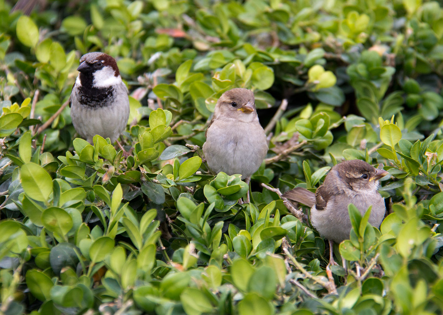 A male house sparrow with two fledgelings in front of Notre Dame Cathedral in Paris.