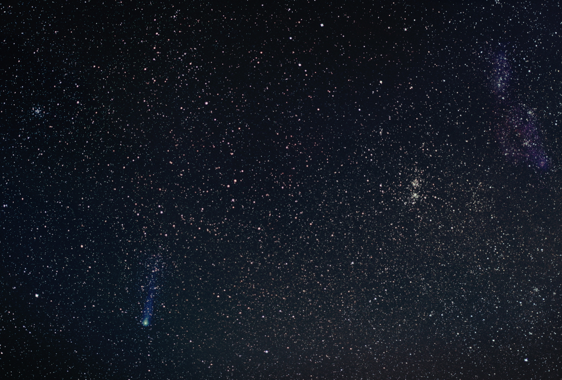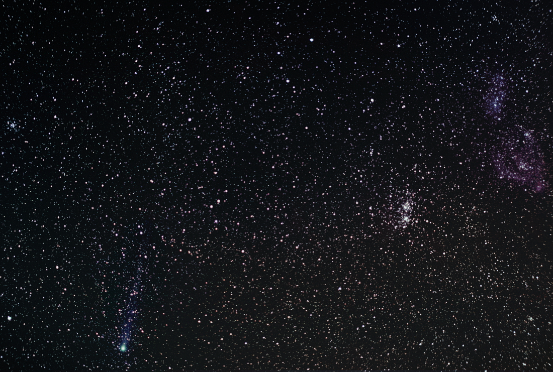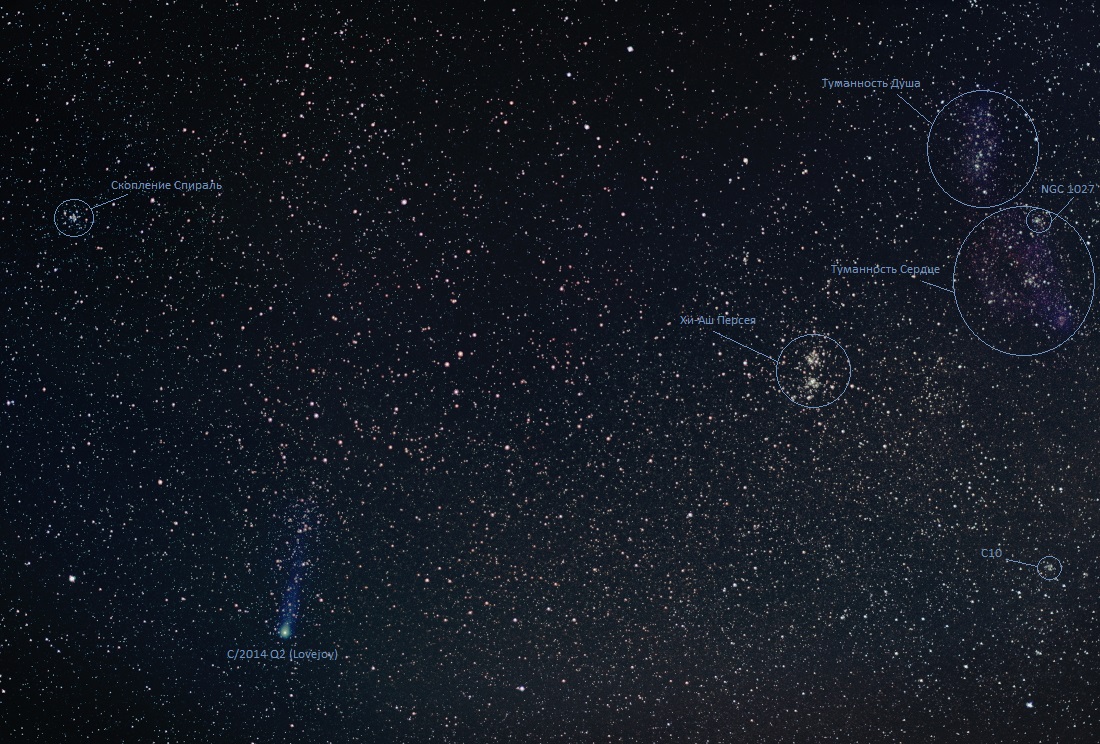 Комета Лавджоя хоть и начала неминуемое угасание, по-прежнему остается интересным объектом для наблюдения и фотосъемки. 10 февраля повезло с погодой, что позволило поснимать комету среди интересных соседей по небу, ради которых добавил снимок с подписями. Спираль, С10, Хи-Аш Персея и NGC 1027 - относительно хорошо различимые на снимке рассеянные звездные скопления, также присутствуют эмиссионные туманности Душа и Сердце.