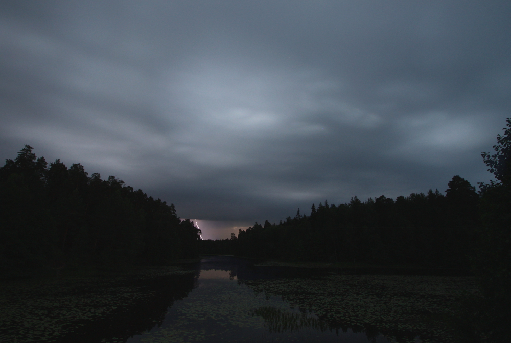 Небольшое шаманство в DSS и GIMP: сведение трех кадров в один. На темном кадре была молния, на более светлых лишь всполохи, зато пейзаж был более-менее заметен. Теперь есть и пейзаж, и молния.
