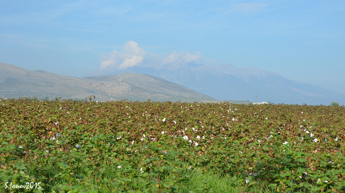 Никогда не видел растущий хлопок и не ожидал увидеть его в Греции. Всё же он ассоциируется с Узбекистаном, Таджикистаном и пр. В местах его произрастания и уборки всё засыпано хлопковой ватой. Она и на придорожных кустах и на обочинах. Снимать, к сожалению, пришлось наспех, пожертвовав обедом в дорожном кафе.