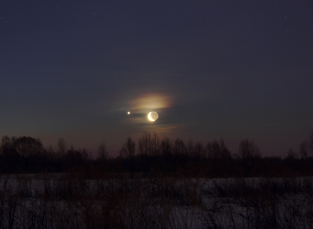 Соединение Луны и Венеры утром 26 февраля 2014 года, снято на окраине Нижнего Новгорода. Поскольку использовалась длинная выдержка (13 секунд), применена небольшая "хитрость" - земля взята с фото, сделанного с неподвижного штатива, а небо с фотографии, сделанной с ведением за звездами. А если еще точнее, земля - это 4 наложенные друг на друга фото (яркость усреднена) - это позволяет снизить шум. Небо - 2 фото.