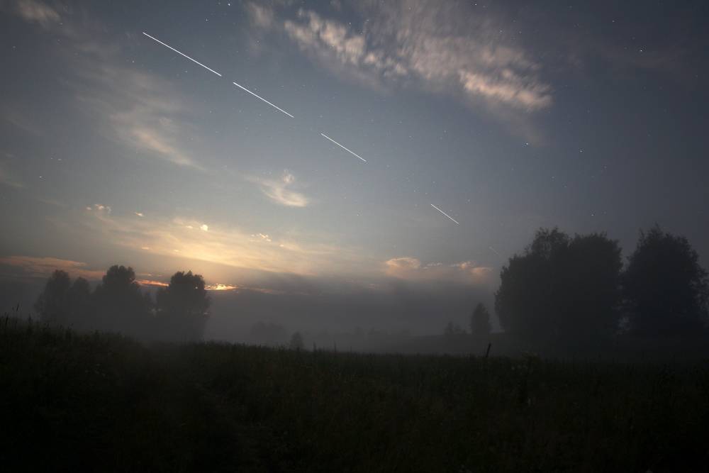 Следы человеческой деятельности в дикой природе давно перестали ограничиваться дорогами и постройками, иногда они появляются масштабно и неожиданно там, где, казалось бы, человек еще не слишком много "наследил". Снимая заход луны за окраиной деревни, я нечаянно застал пролет Международной Космической Станции. Готов я к этому не был, в итоге снять его единой экспозицией не получилось - на изображении сведены треки с 5 кадров, сделанных через некоторые промежутки времени, из-за чего в траектории полета МКС появились "разрывы".