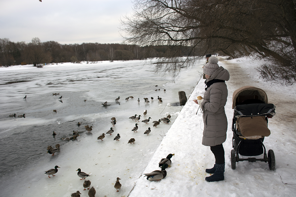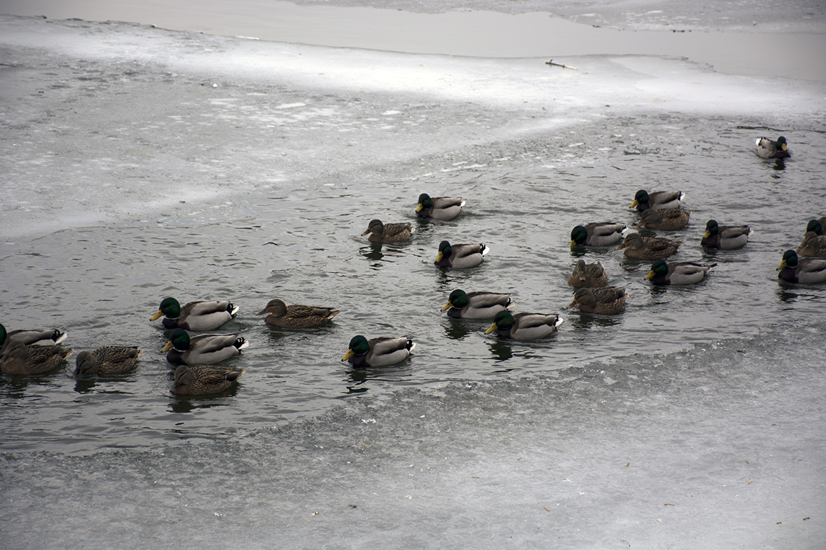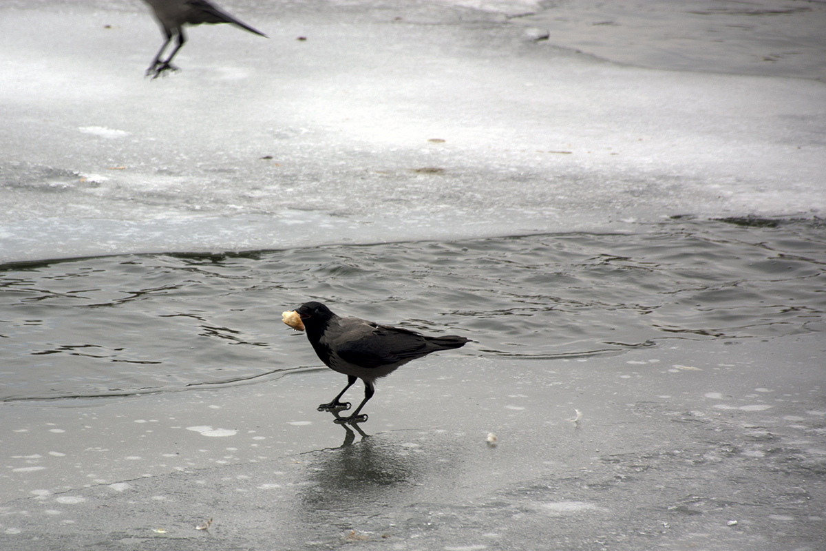 Вороны наловчились таскать хлеб у утей- вытягивают прямо из клюва))) И воды не боятся- как водоплавающие по льду рассекают)