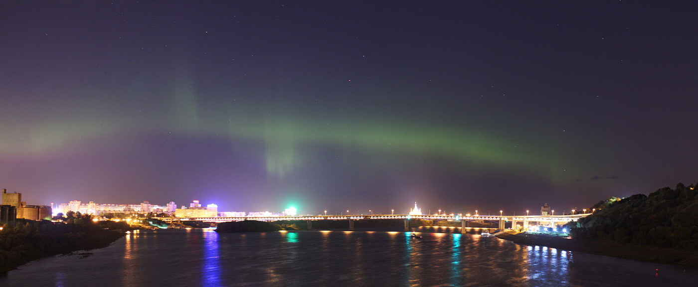 Наконец-то удалось увидеть и сфотографировать полярное сияние, и не где-то на Севере, а в Нижнем Новгороде (55 градусов северной широты). В момент кульминации (примерно 23.40 7 сентября) протянувшаяся от берега до берега дуга была уверенно видна невооруженным глазом, зеленый цвет прекрасно был виден несмотря на городскую засветку. Незабываемые впечатления!