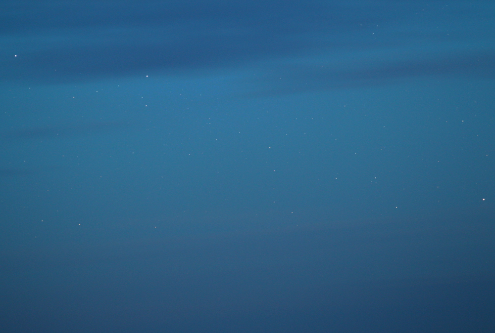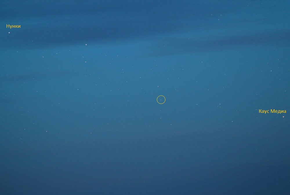 Новая звезда - термин, которым обозначают катаклизматические переменные звезды, внезапно увеличивающие яркость в тысячи и более раз. Это и правда может выглядеть как появление звезды там, где ее до этого не было. Новые - это двойные звездные системы, состоящие из белого карлика и компаньона (например, красного гиганта). Вещество (в первую очередь водород) перетекает с компаньона на плотный белый карлик, что в определенный момент приводит к взрывоподобному ускорению протекания термоядерных реакций и выделению огромного количества энергии. Открыта эта новая была в марте 2015 года, в максимуме она достигла величины +4,5m, т.е. хорошо была видна невооруженным глазом. С апреля я несколько раз пытался ее сфотографировать, но удалось это сделать только в ночь с 13 на 14 июня 2015 года на светлом небе (хоть съемка и велась около полуночи). Дело в том, что Стрелец, где находится новая, в наших широтах лишь слегка выглядывает из-за горизонта, и новая поднимается только на 3-4 градуса. Малейшая облачность на юге - и наблюдать ее не представляется возможным. Впрочем, и в данном случае погода не была идеальной, что отлично видно на фото. На втором изображении новая отмечена кружком, также подписаны яркие звезды Стрельца. Судя по яркости соседних звезд, яркость новой на момент съемки составила примерно +7m - увы, не удалось заснять ее, когда она была ярче.