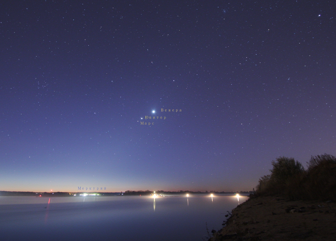Парад планет утром 21 октября 2015 года. Меркурий едва показался над горизонтом, также можно увидеть растворяющийся в утренней заре зодиакальный свет.