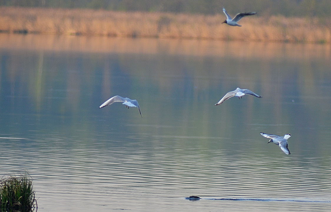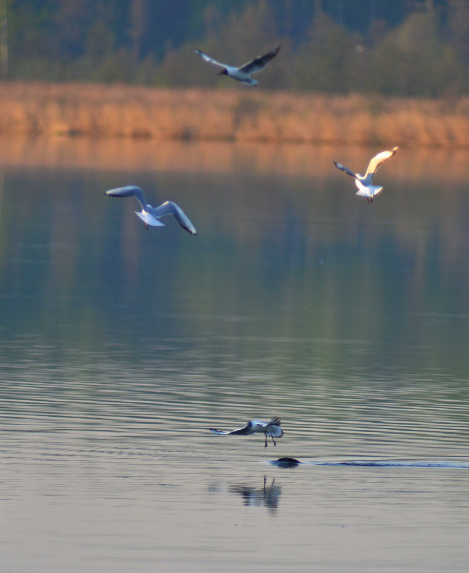 Зачем бобр плавал к гнездовьям чаек, может хотел яичком перекусить? Но чайки всполошились не на шутки и атаковали его на всем пути обратно, бобр иногда нырял, но затем опять всплывал и плыл поверху, чайки атаковали не очень агрессивно- ни одного удара не было.
