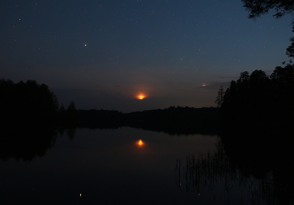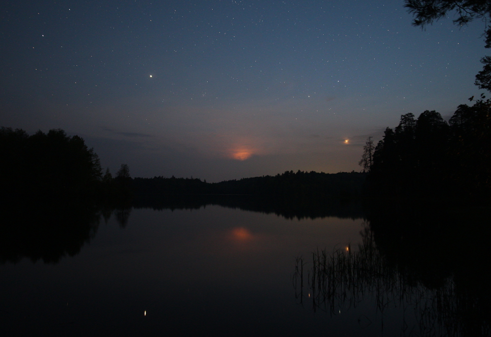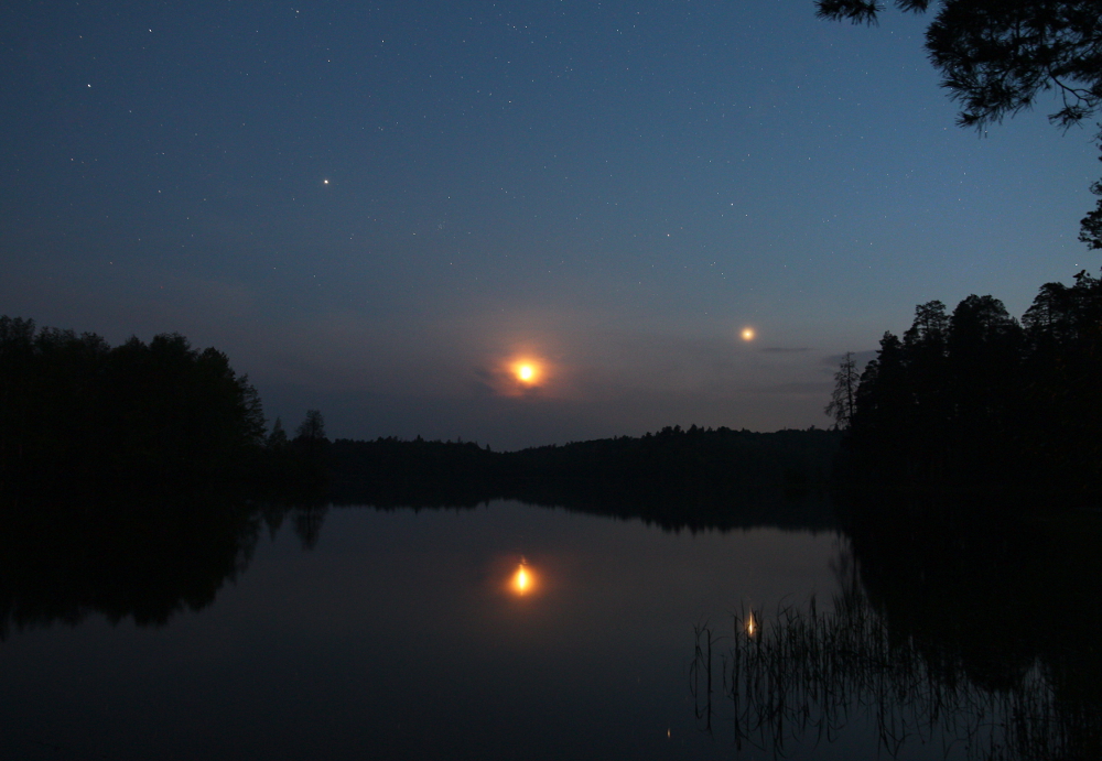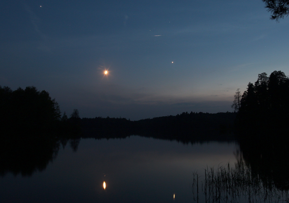Самые яркие светила ночного неба - Луна, Венера и Юпитер. Фото выложены в обратном хронологическом порядке, будто Луна и ее компаньоны восходят - просто фото, ставшее первым, мне больше нравится. На последнем фото яркий след оставил блеснувший в солнечных лучах спутник.