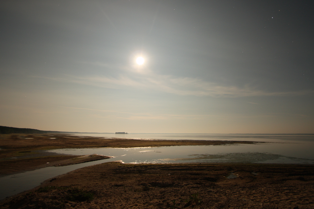 Август 2014 года. Обмелевшее Горьковское "море" при полной луне, находящейся в перигее (ближе всего к Земле); такую луну называют суперлуной, она на 14% больше и на 30% ярче, чем в апогее. Второе фото ранее выкладывал, здесь оно переобработано.