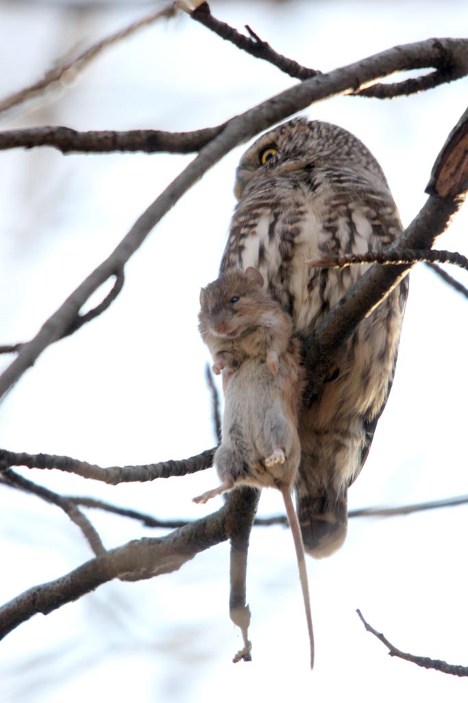 В смысле Юра сначала поймал мышку и привязал её к лапе ранее пойманного воробьиного сычика, а потом их обоих приклеил к ветке?
