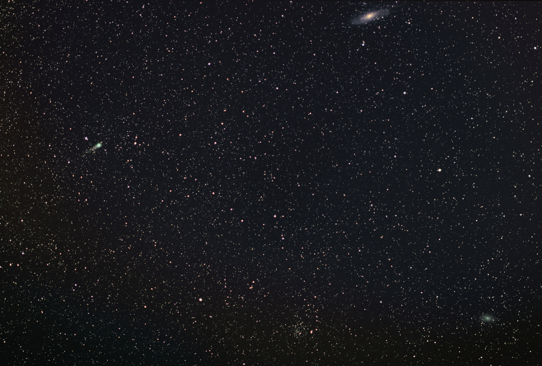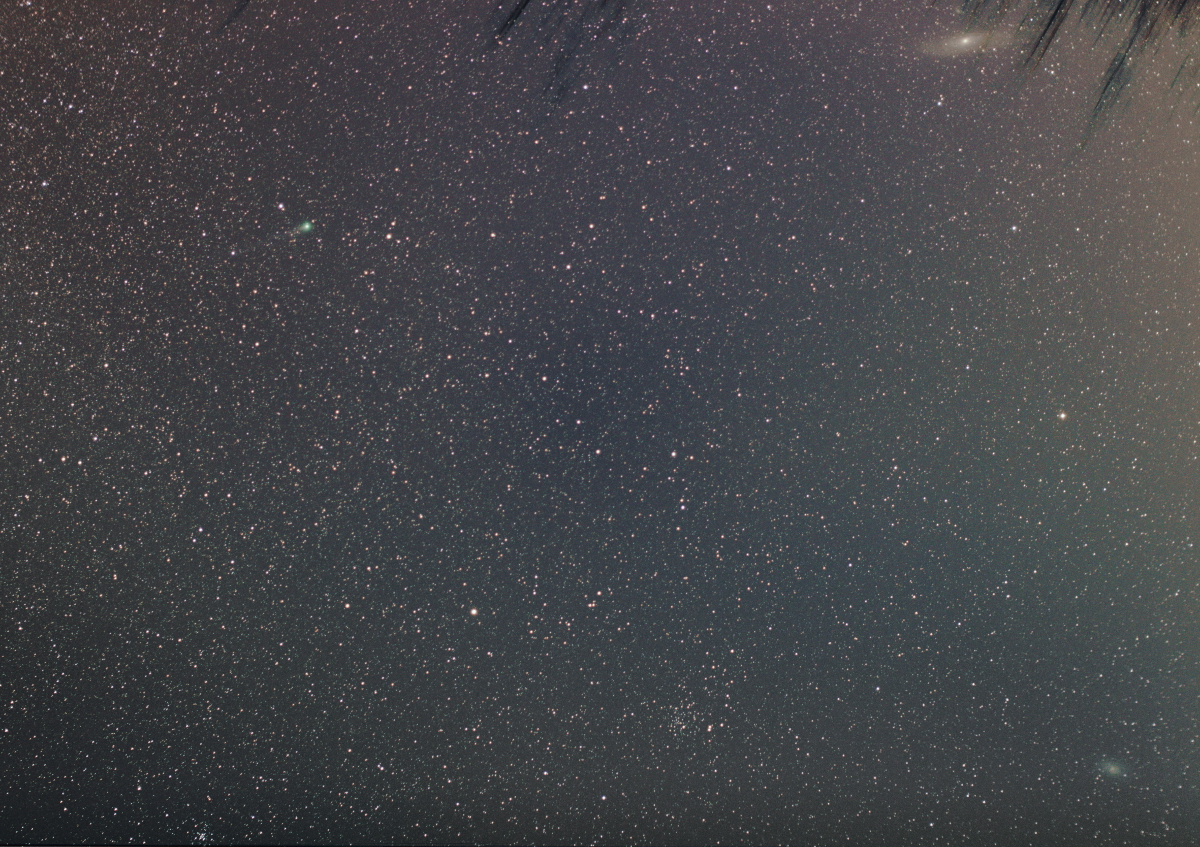 Комета Лавджоя, Галактика Андромеды М31 (вверху) и Галактика Треугольника М33 (внизу справа). Первое изображение - результат сведения и обработки 50-ти 20-секундных кадров, снятых на окраине Нижнего Новгорода. Второе получено из 30-ти 25-секундных кадров, более естественно обработано, но в кадр влезли ветви дерева, оставившие на итоговом изображении полосы.