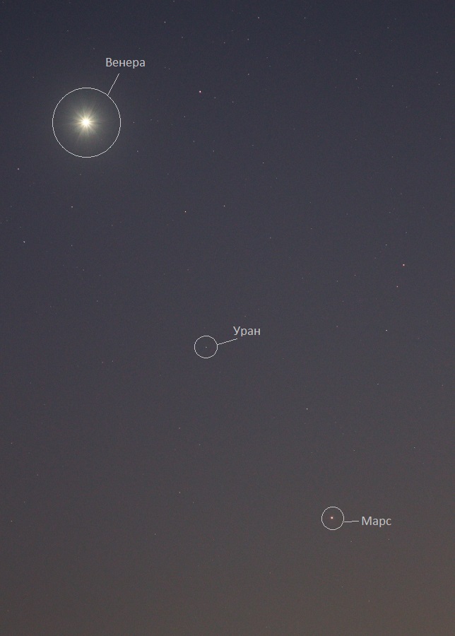 Соединение Венеры, Урана и Марса 7 марта 2015 года. Событие не очень зрелищное: Уран хоть и гигант, но из-за большой удаленности от Солнца ярче 5 звездной величины на земном небе не бывает. Но момент, тем не менее, редкий и интересный.
