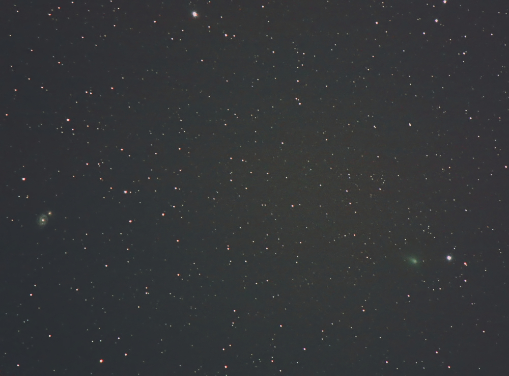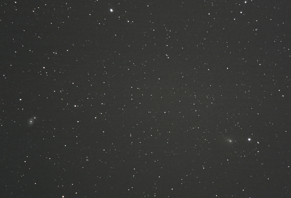 Комета C/2012 K1 (PanSTARRS) "встретилась" на небе с галактикой М51. Комета на фото находится справа, М51 - слева, угловое расстояние между ними на момент съемки (в ночь с 3 на 4 мая 2014 года) равнялось примерно 2,5 градусам. Наиболее близким соседство кометы и галактики М51 было 2 мая, теперь красивая пара распадается - комета быстро перемещается по небу, устремляясь в сторону Солнца. Изображение - результат сведения в DSS 14-и 20-секундных кадров, полученных при помощи фотокамеры Canon 450D и объектива Canon EF-S 55-250; ISO 1600, диафрагма 5,6, фокусное расстояние 250, применялась самодельная монтировка с часовым приводом.