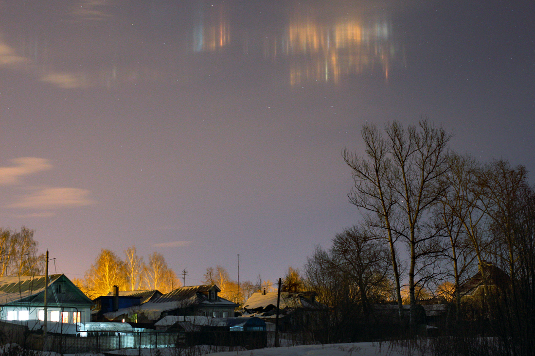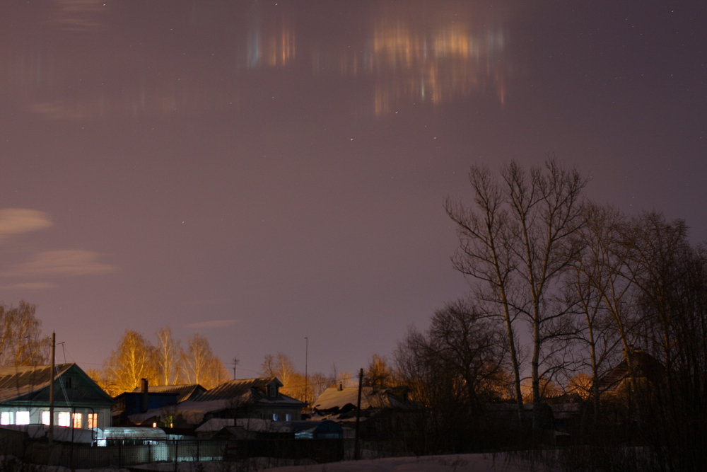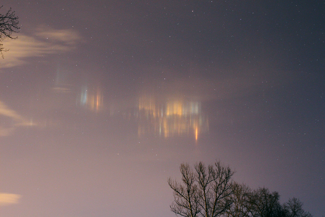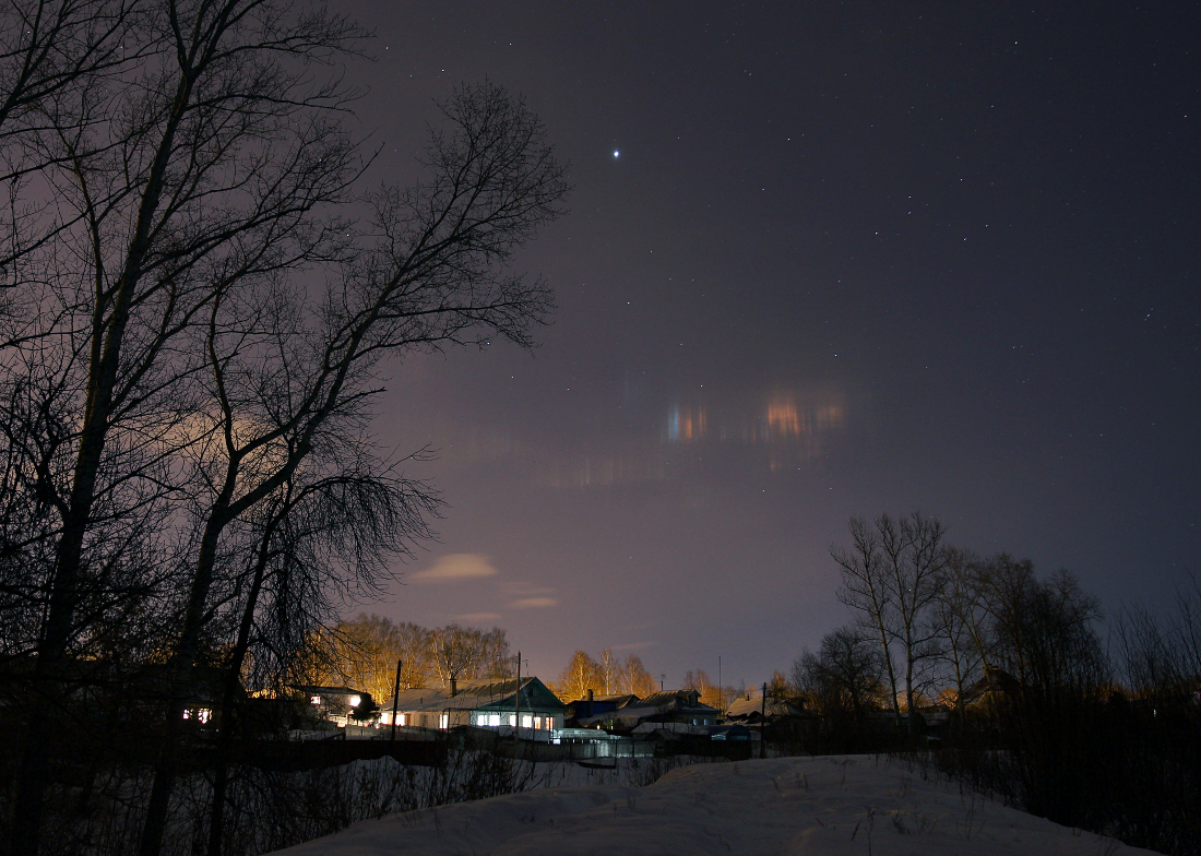 Световые столбы - довольно распространенное явление, возникающее как над яркими светилами - солнцем и луной - так и над искусственными источниками света. Такие столбы появляются из-за отражения света в кристалликах льда, расположенных в массе своей горизонтально. Обычно над искусственными источниками света их видно во время снегопадов, тогда они продолжаются от земли до самых облаков, поскольку вся масса воздуха заполнена падающими кристаллами льда. Но бывают более интересные моменты, когда в практически чистом воздухе парят легкие прозрачные облака из мелких ледяных кристаллов, тогда световые столбы гораздо более компактные, вдобавок, видны на фоне звезд. Такие столбы мне и повезло наблюдать в этом месяце.