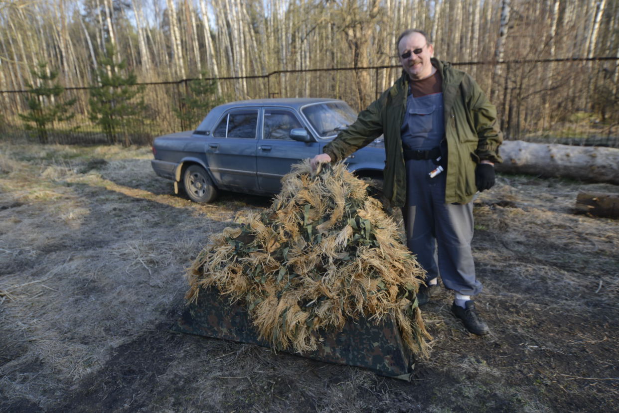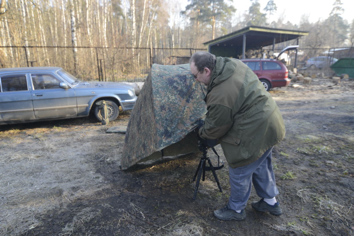 После того как я комфортно уселся со штативом и объективом 300/2,8 с 2-х трансом в засидке на стульчике (не путать со стульчАком) пришла мысль о возможности уменьшить высоту засидки, путем простого складывания последних элементов задних стоек, кончно при этом я пересел со стула на подушку, сделанную Валерой для себя, но штатив стоял спокойно. Вот несколько кадров-1, 2 и там где накинут масхалат "леший"- это точно-уменьшенная версия.