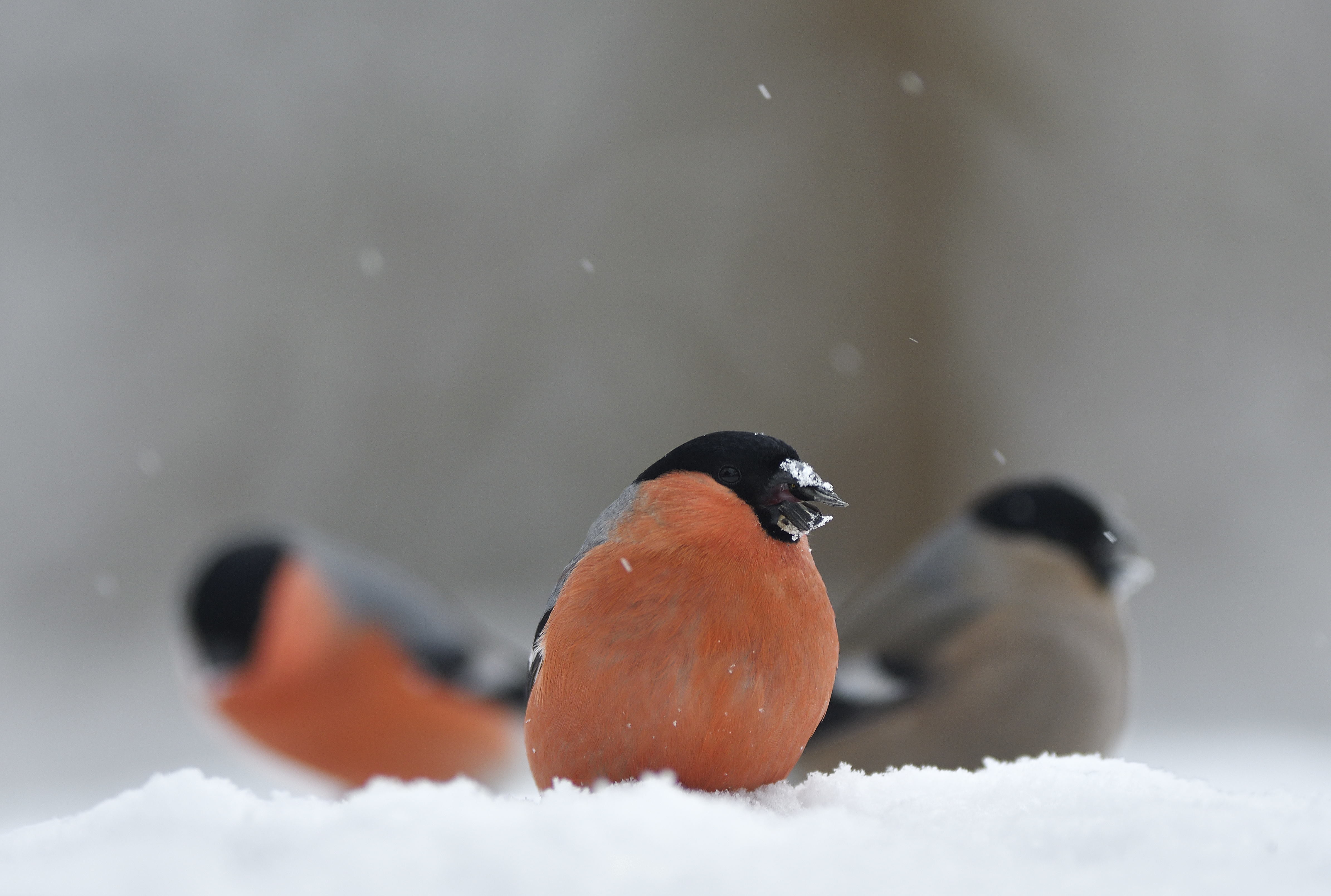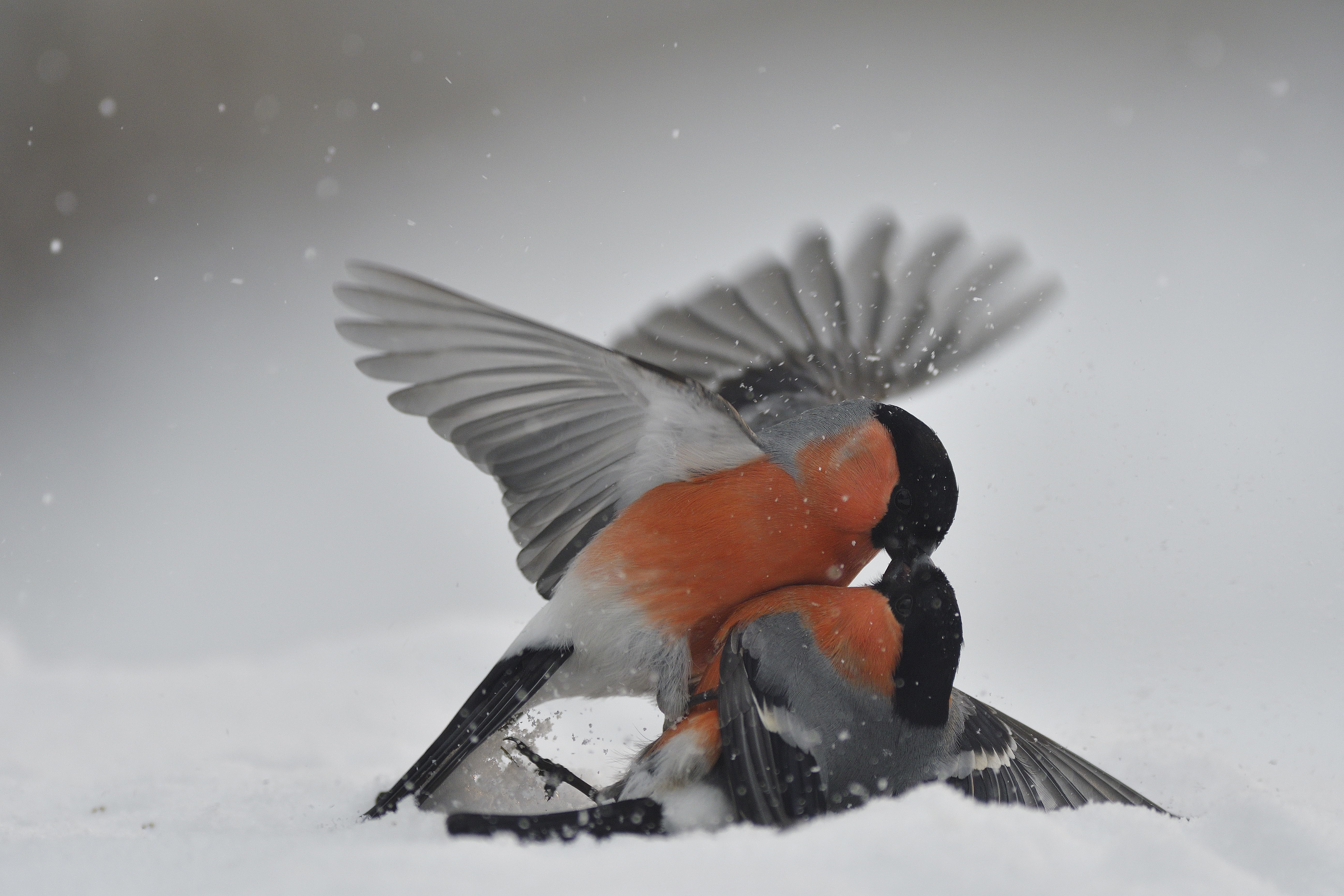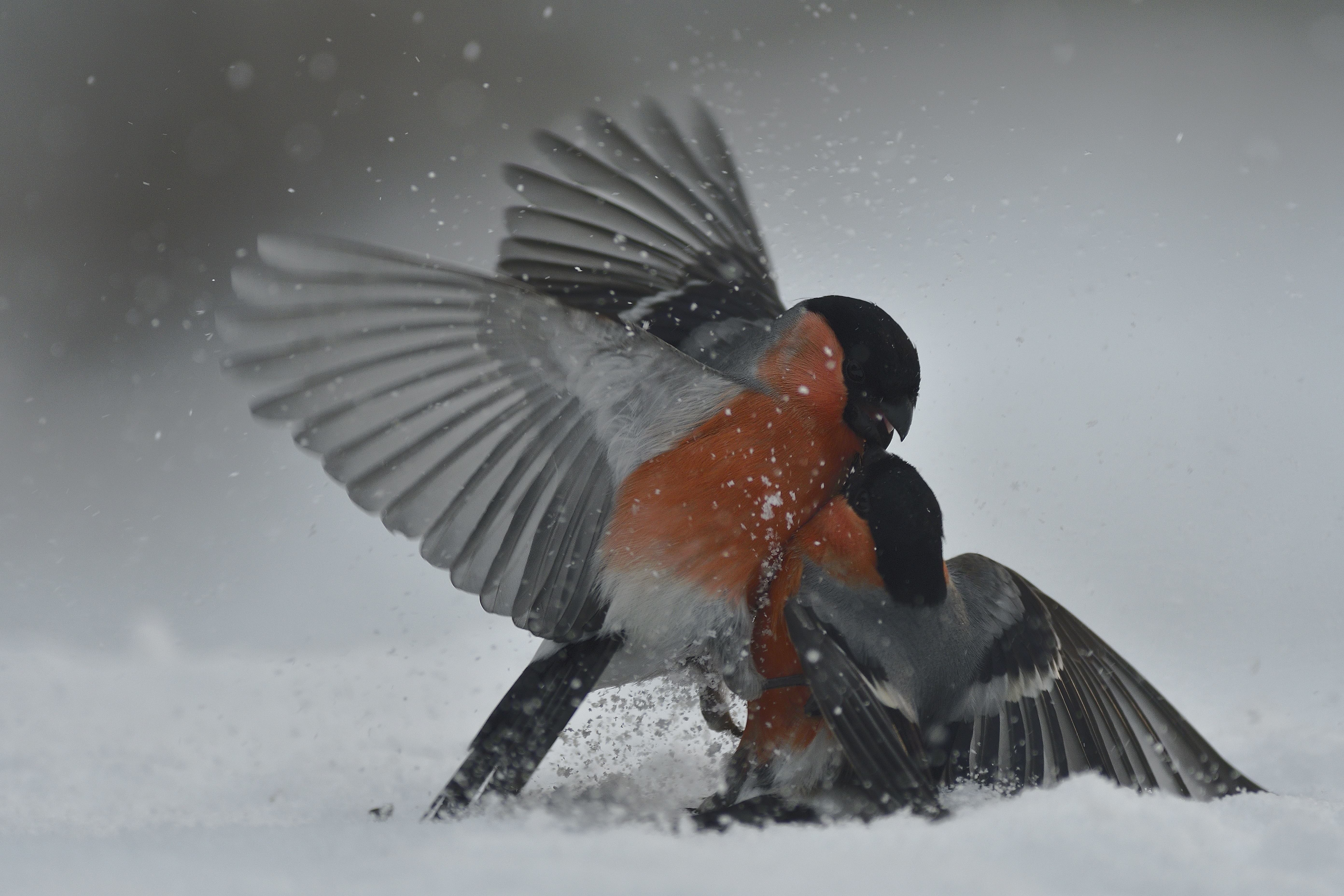 Кто же не знает снегиря- меланхоличную красную птичку, котору мы видим обычно зимой. У него и "песня" то меланхоличная. Неподвижный важный ленивый, какие еще эпитеты приходят в голову глядя как он спокойно лущит семена ясеня или рябину. Но не будите в нем зверя! В гневе снегирь страшен и агрессивен! А может это мы его такими семечками кормили?