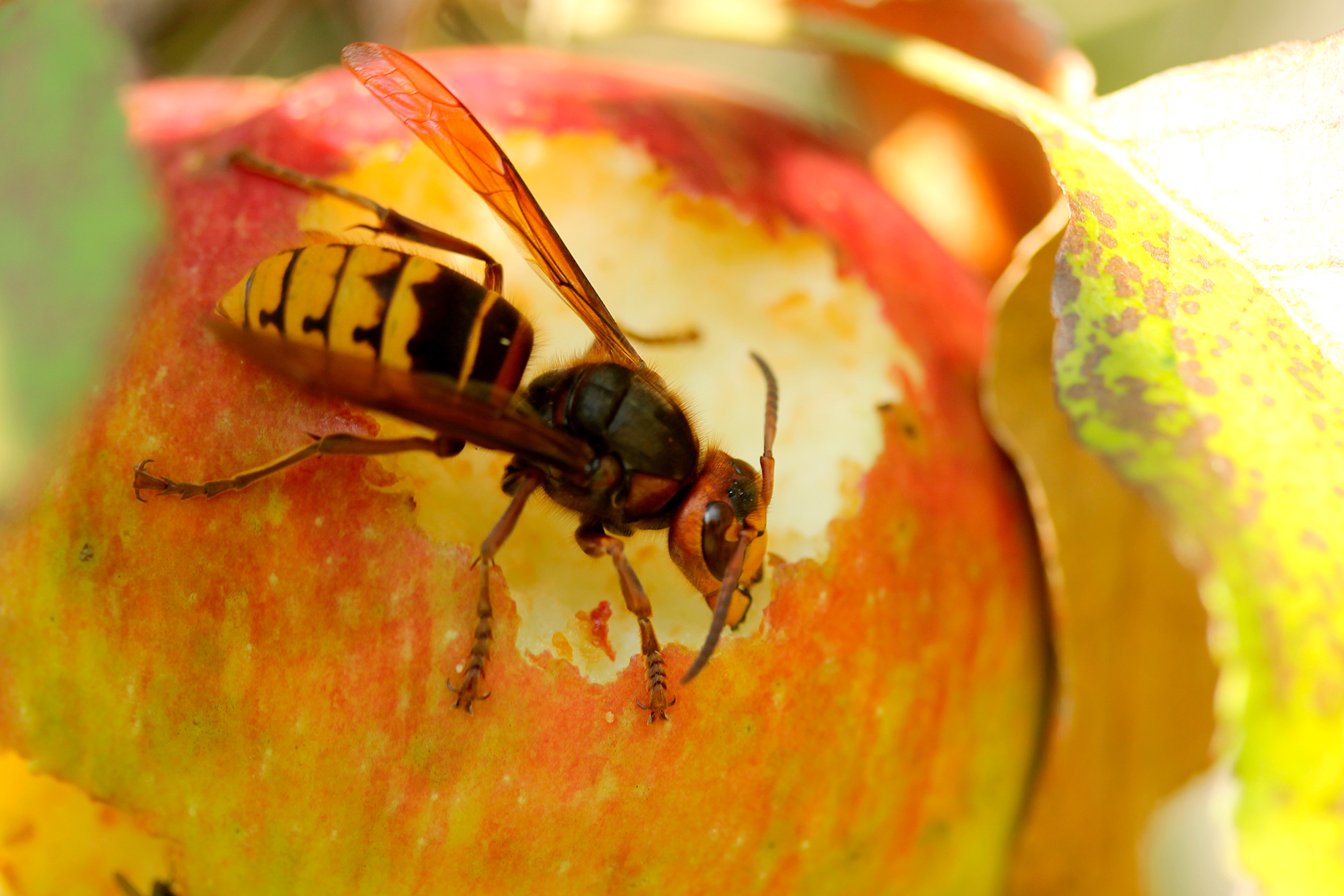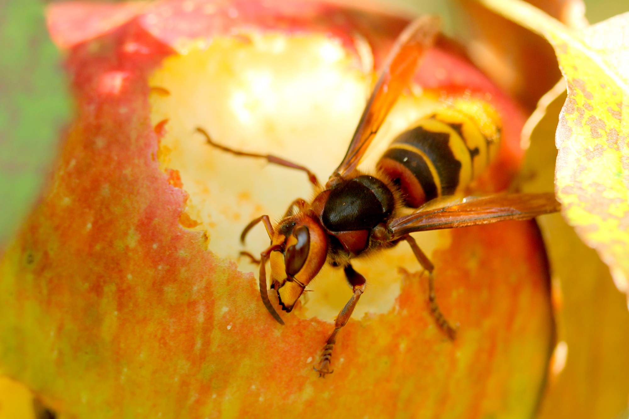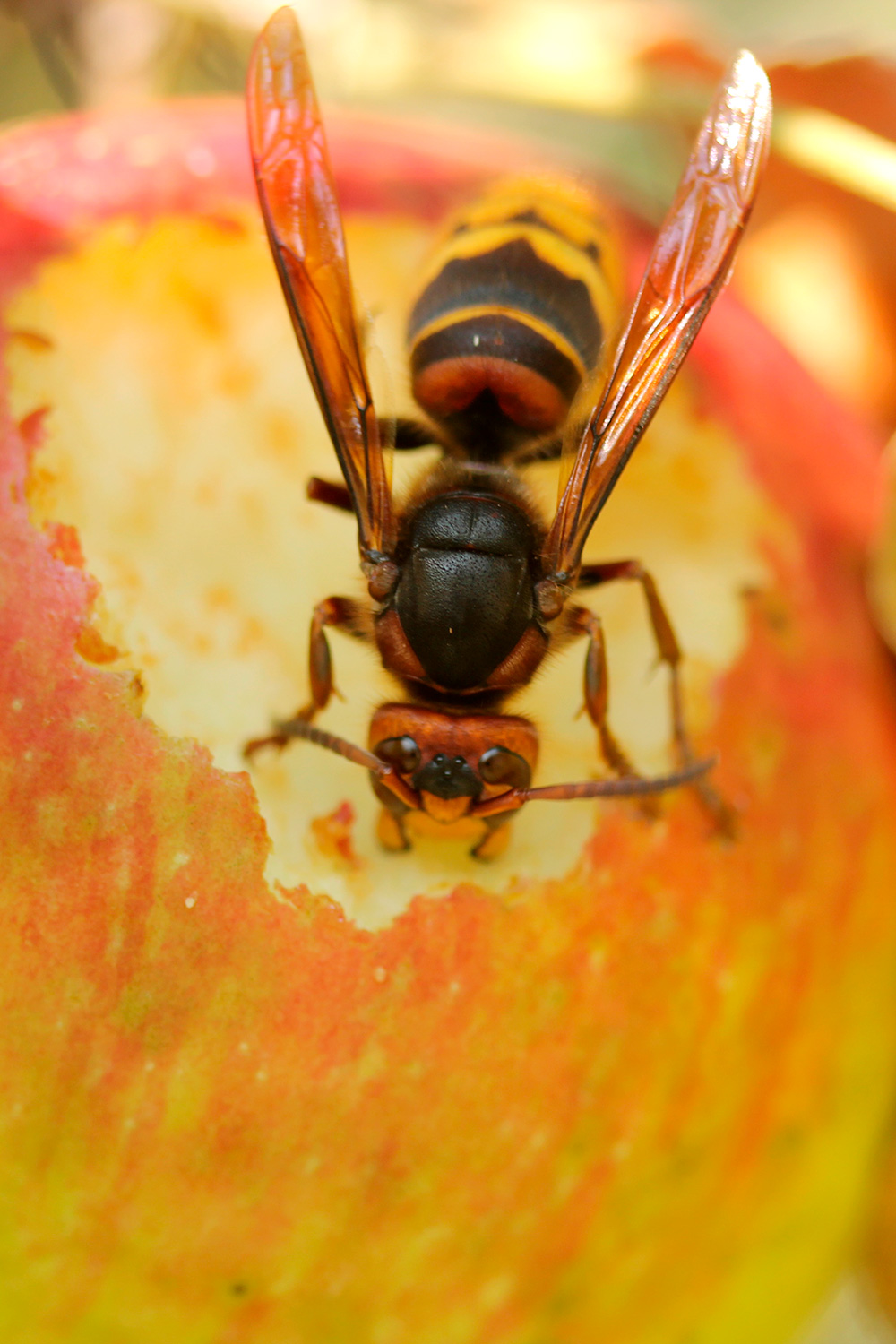 Обнаружил то что в сентябре шершни перешли с добычи насекомых на яблоки. Причем что интересно. Из 7 яблонь разных сортов они ели яблоки лишь на одной. Антоновка и более поздние сорта их не интересовали. А на этой яблоне были надкусаны практически все яблоки. Наверное были вкусными. И мухи, которые также питались этими яблоками, их не интересовали.