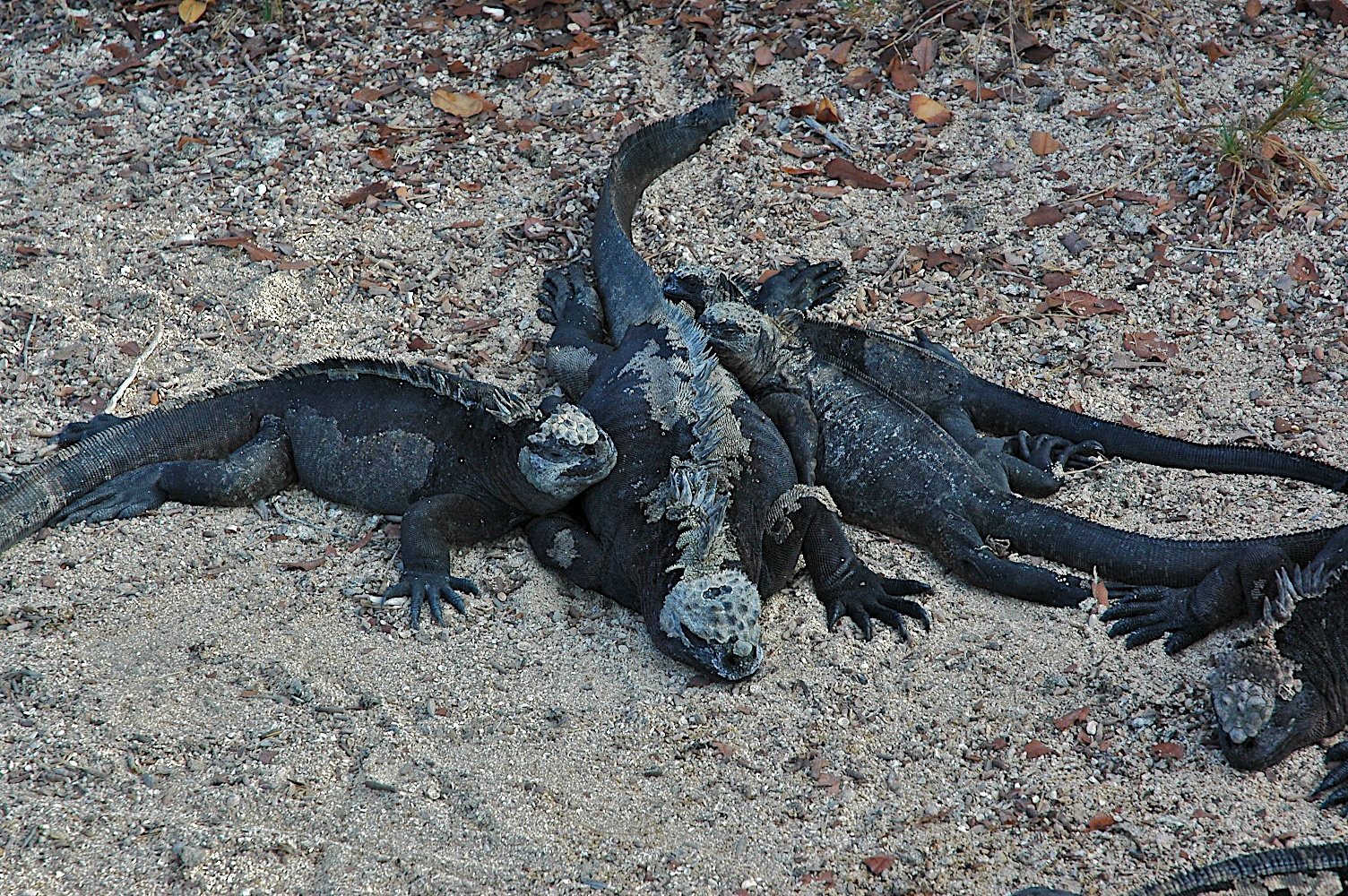 Все снимки сделаны на о. Санта-Крус, там их довольно много. На последнем снимке - скопление игуан перед заходом солнца, поскольку игуаны это холоднокровные животные, сбиваясь по вечерам в такие плотные скопления, они дольше могут сохранить тепло, накопленное за день.