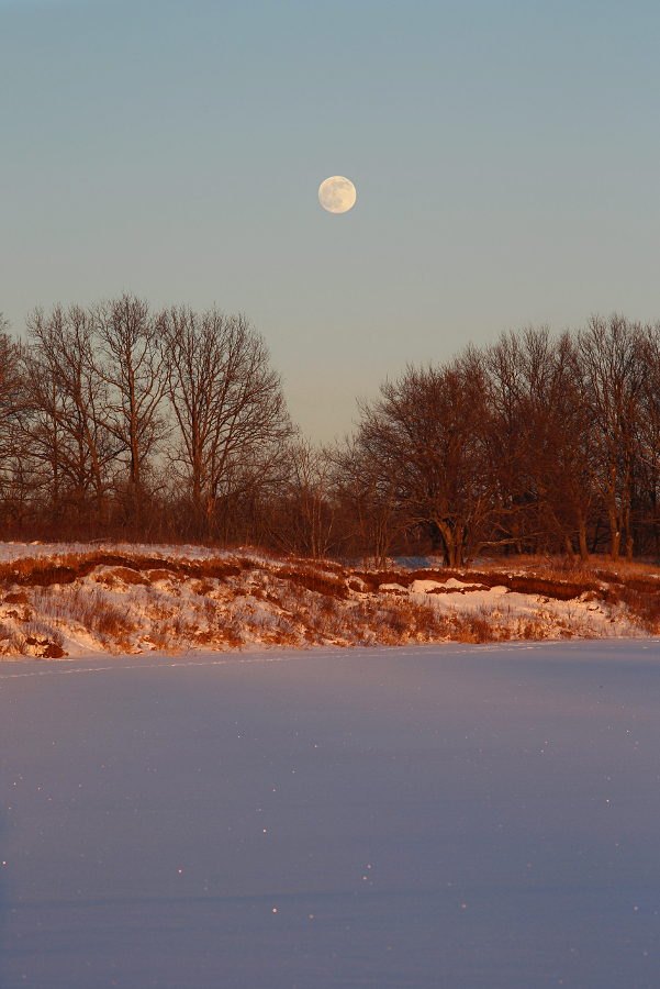 Восход луны со льда реки Клязьмы во Владимирской области, 8 февраля 2020.