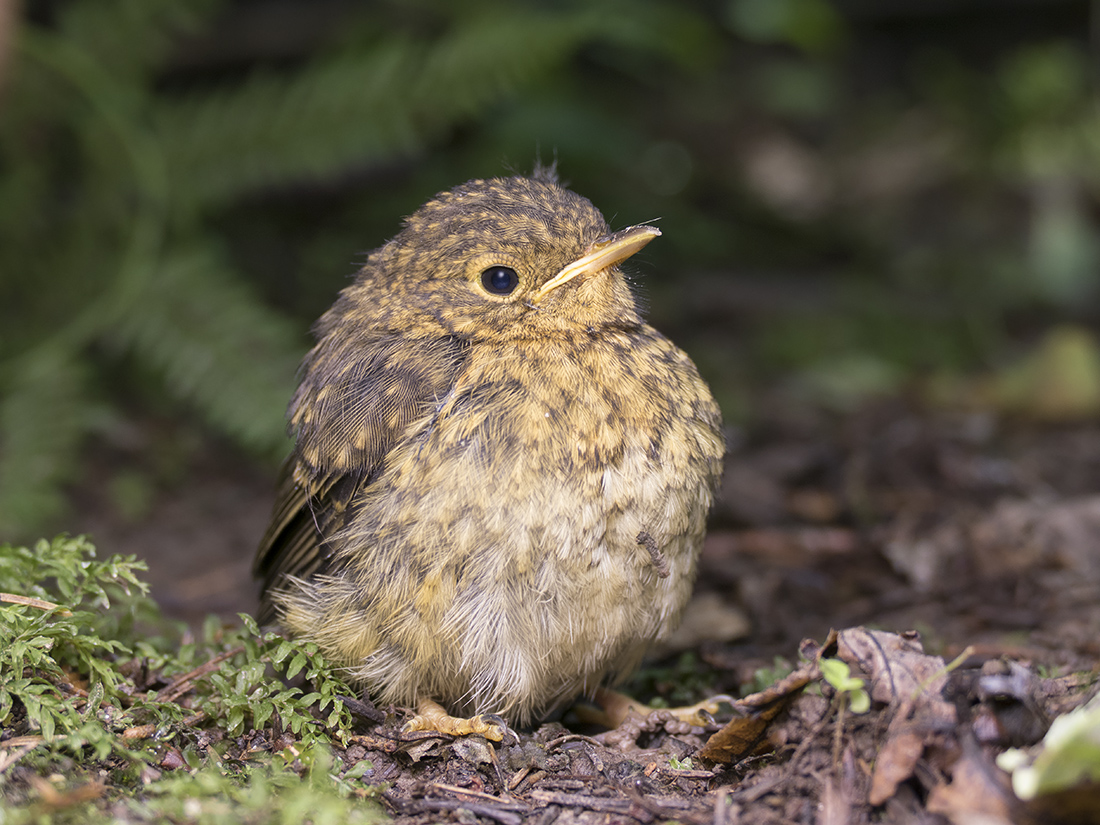 Наверное, слёток зарянки. Заметил его когда миксомицеты снимал. Совсем не боялся. А когда стал уходить, то он за мной попрыгал. Пришлось ускорить шаг, чтобы он от меня отстал.
