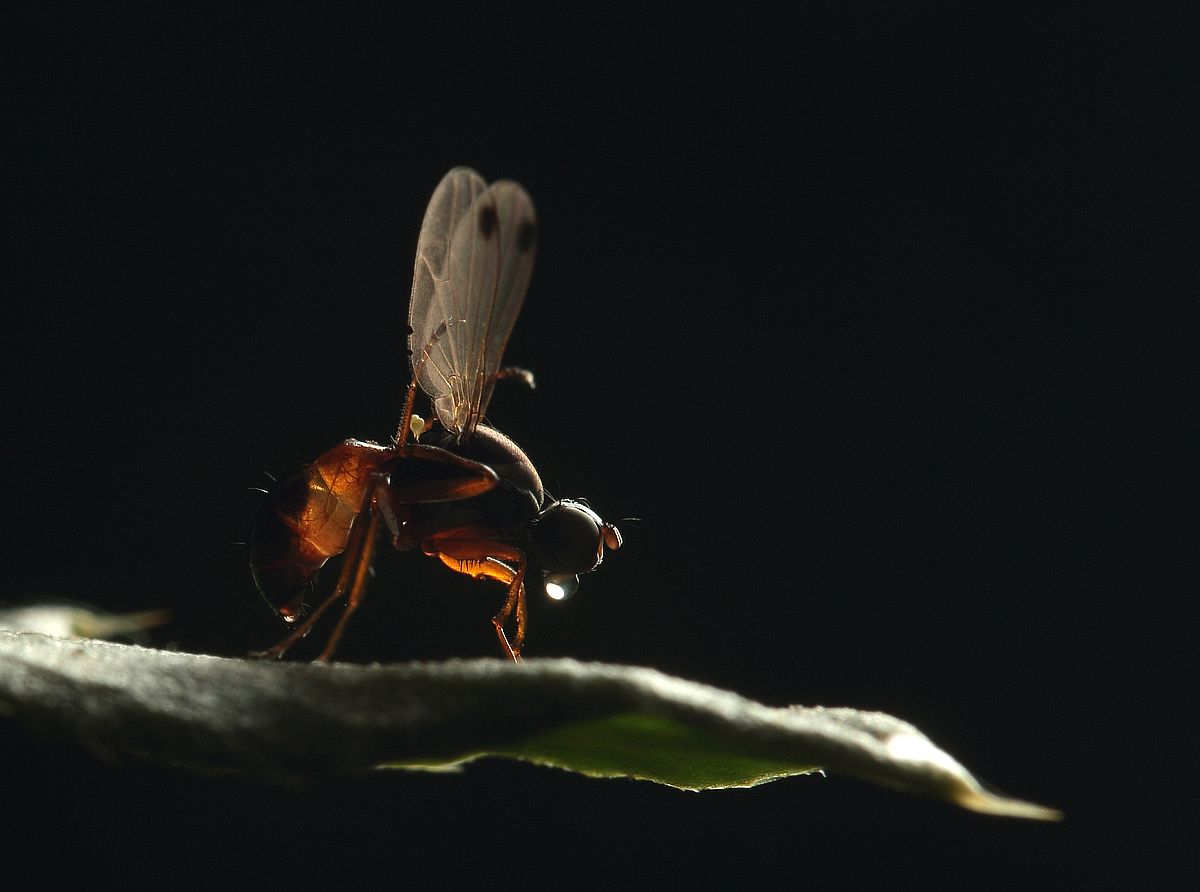 Мушка сидела на листике, подавала всякие-разные таинственные знаки крыльями, а в какой-то момент замерла - подняв вверх крылья и пару ног, и начала гонять туда-сюда капельку.