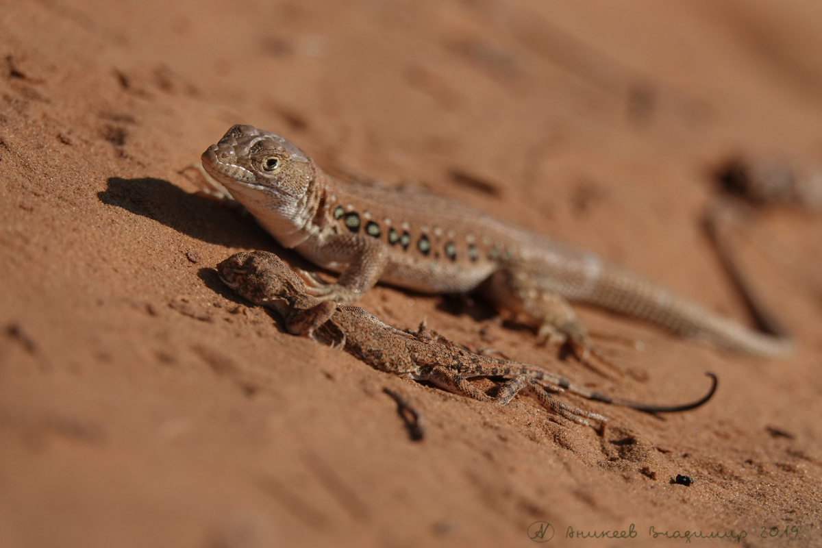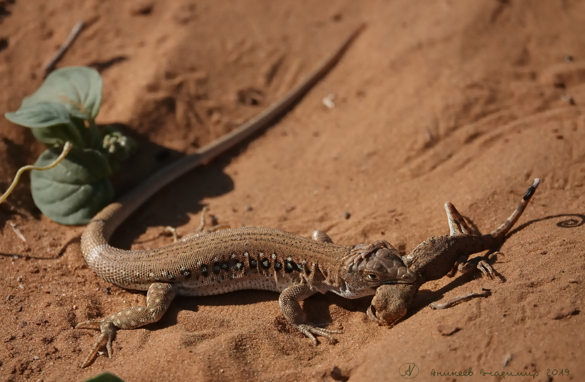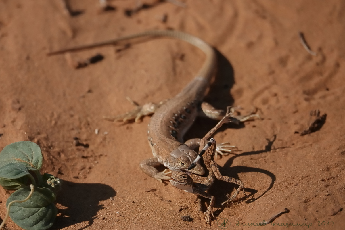 Прибежал и увидел, как потом оказалось уникальную картину- ящерица, которой по заветам зоологов не полагается питаться ничем... кроме насекомых, нагло жрёт сородича- крошечную круглоголовку, просто педофилка какая-то! Да еще с извращениями- пожует, бросит еще живую, опять мусолит и жуёт. Мы с секретаршей крутимся вокруг, то ляжем то сядем- то ближе то дальше- занимаемся короче фотопроцессом- снимаем со всех сторон, как говорит наш коллега, тов. Т-т.- «на фотокарточки».