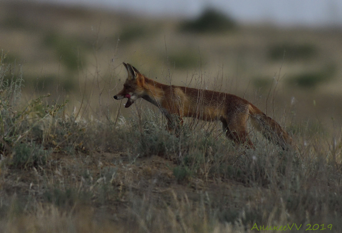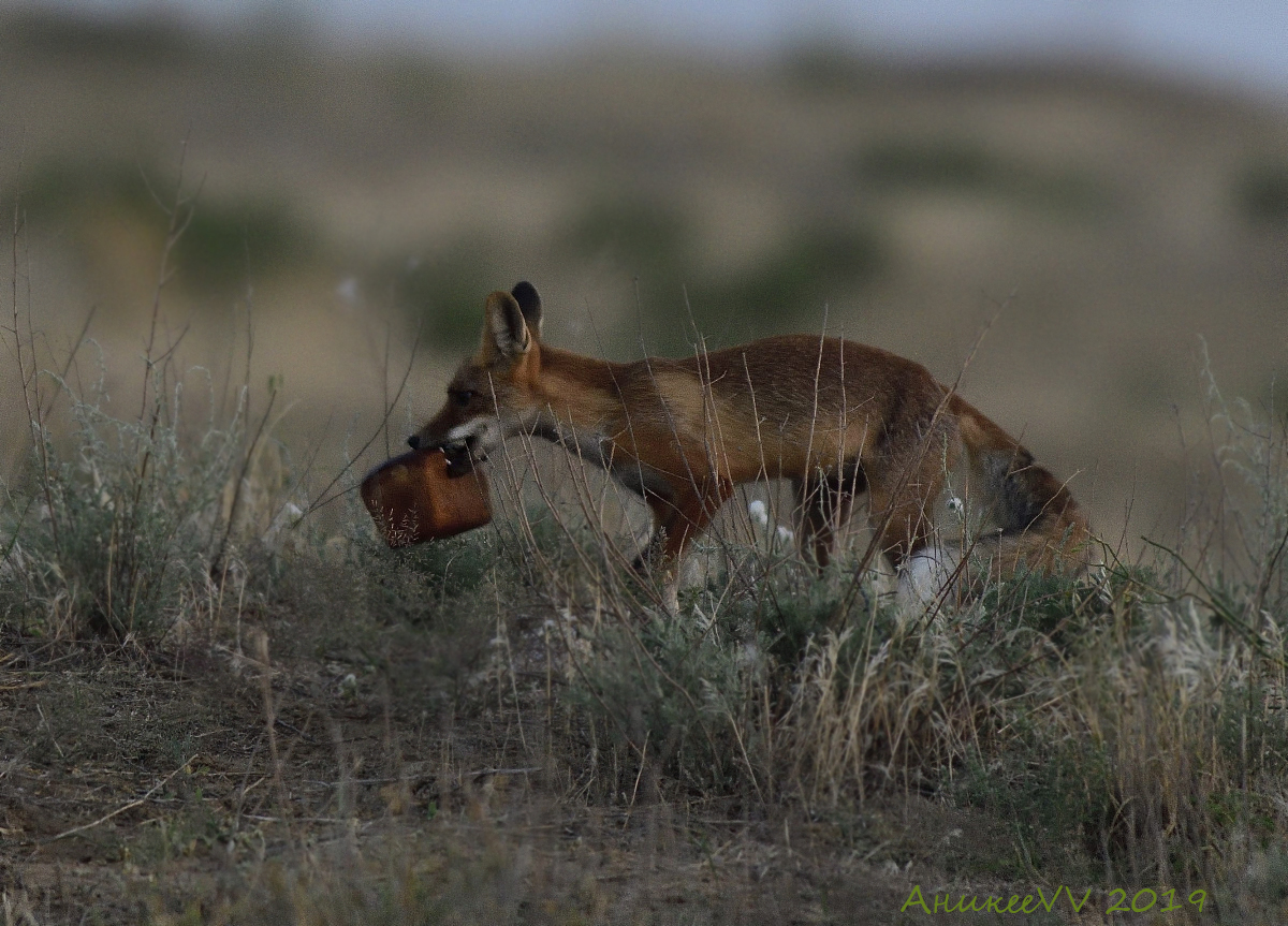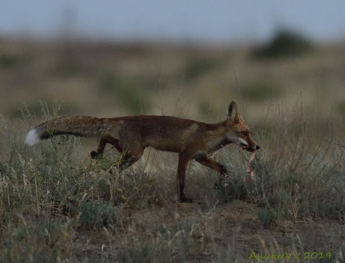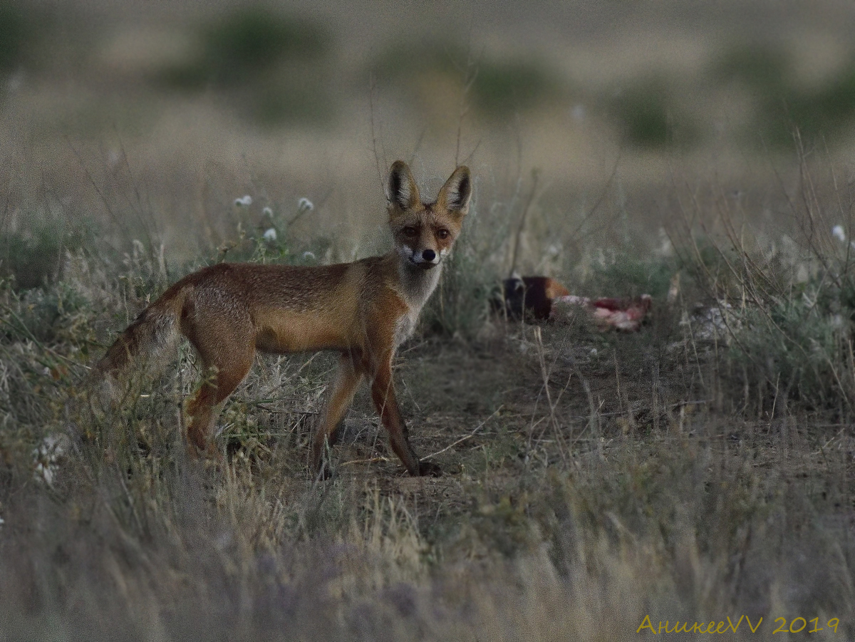 И вот с первым светом появился зверь. Длинноногая строная и очень боязливая степная лисица. Постоянно оглядываясь и заходя с разных сторон она один за другим утащила мясо и съела за кустами. Но аппетит только разгулялся, а тут лежит что-то большое и так вкусно пахнет. И она начала кружить вокруг буханки- заходила слева, справа, но буханку не так просто утащить. Наконец она ее прихватила и побежала, но потеряла по дороге и уже не вернулась.