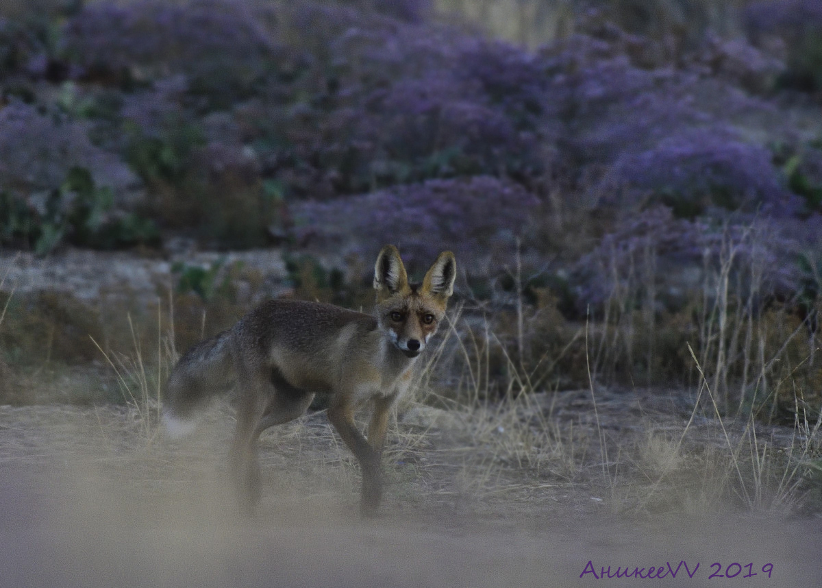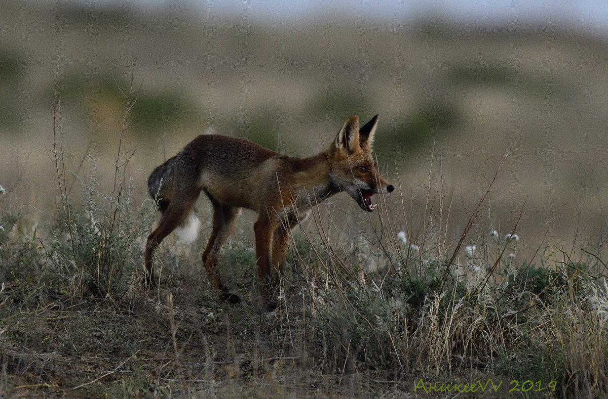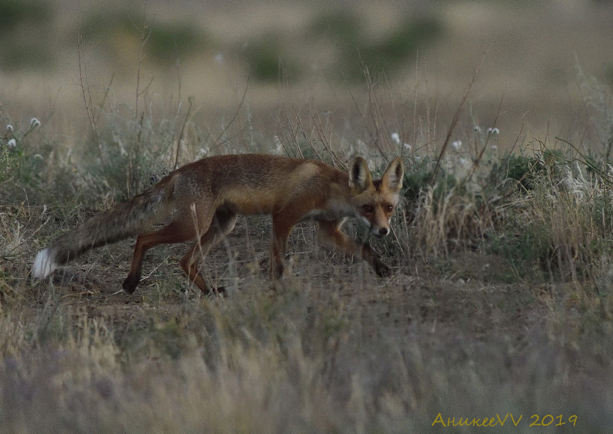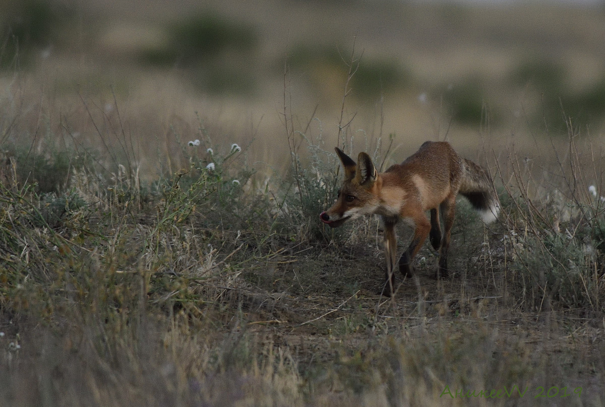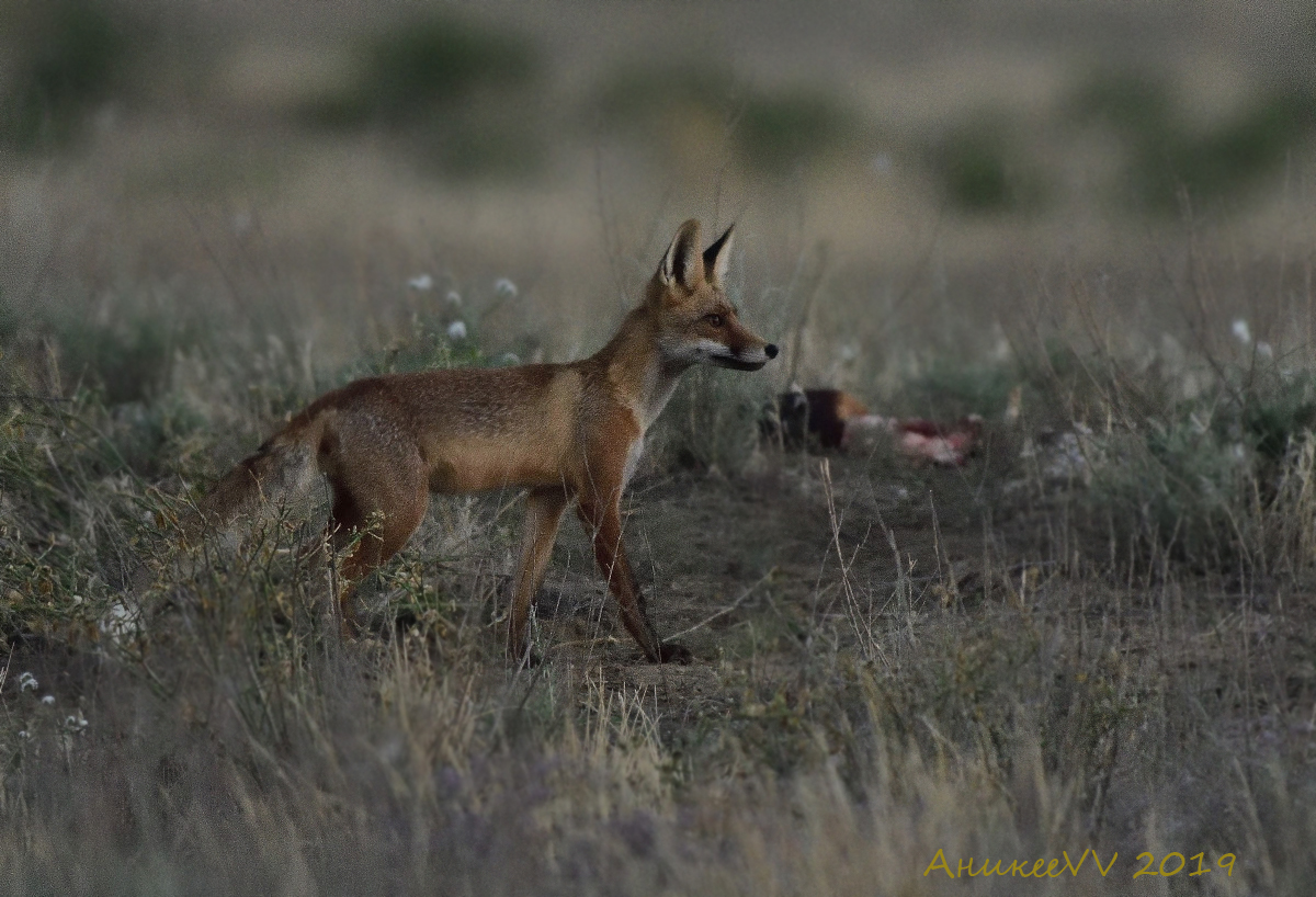 И вот с первым светом появился зверь. Длинноногая строная и очень боязливая степная лисица. Постоянно оглядываясь и заходя с разных сторон она один за другим утащила мясо и съела за кустами. Но аппетит только разгулялся, а тут лежит что-то большое и так вкусно пахнет. И она начала кружить вокруг буханки- заходила слева, справа, но буханку не так просто утащить. Наконец она ее прихватила и побежала, но потеряла по дороге и уже не вернулась.