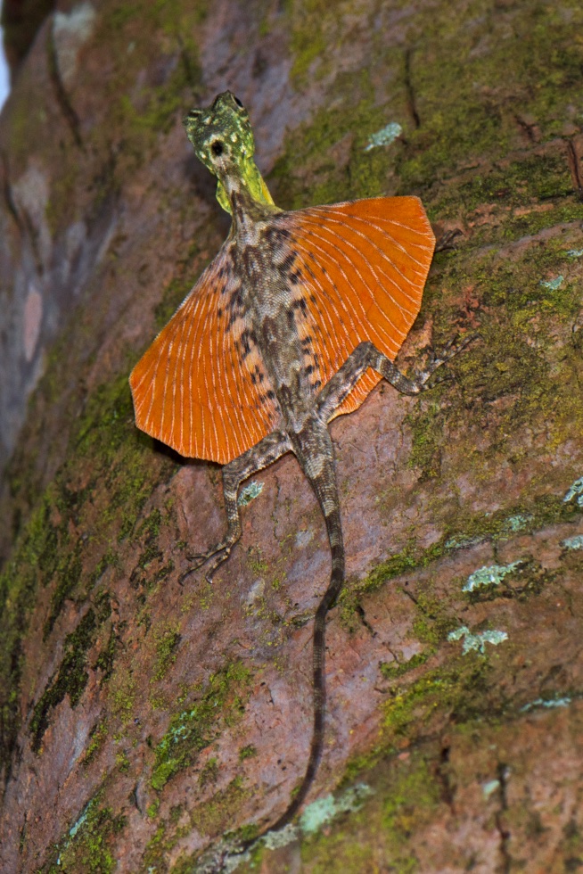 Летающий дракон - это не только фольклорный персонаж различных сказаний и романов в стиле фэнтези, но и вполне реальное живое существо. Правда, миниатюрное. Свое название драконы получили благодаря способности перелетать при помощи своеобразных "крыльев" с дерева на дерево.Обитают летучие драконы в тропических лесах Юго-Восточной Азии: на о. Борнео, Суматра, в Малайзии, на Филиппинах, Индонезии и Южной Индии. Живут они в кронах деревьев, где проводят большую часть своей жизни. На землю спускаются только в двух случаях – для откладывания яиц и если полет не задался.Всего известно около 30 видов летучих драконов. Самый известный и распространенный - Draco volans. Эти ящерицы вырастают не более 40 сантиметров. Имеют тонкое приплюснутое тело и длинный хвост. По бокам расположены широкие кожистые складки, натянутые между шестью «ложными» ребрами. При их раскрытии образуются своеобразные «крылья», с помощью которых драконы могут планировать в воздухе на расстояние до 60 метров.У самцов на горле располагается специальная кожная складка, выдвигающаяся вперед. Она служит стабилизатором тела при полете.Летучих драконов трудно заметить, потому что благодаря своей однотонной окраске (зеленой или серо-коричневой) они сливаются с густой листвой или корой дерева. А вот крылья, наоборот, имеют яркую и пеструю окраску – красную, желтую, ярко-зеленую и т.д.Летать они могут как по горизонтали, так и по вертикали и при этом быстро менять направление своего полета. Каждая взрослая особь имеет свою территорию, состоящую из нескольких деревьев, располагающихся поблизости.Полет позволяет этим ящерицам находить новые места пропитания. В их основной рацион входят муравьи и личинки других насекомых.