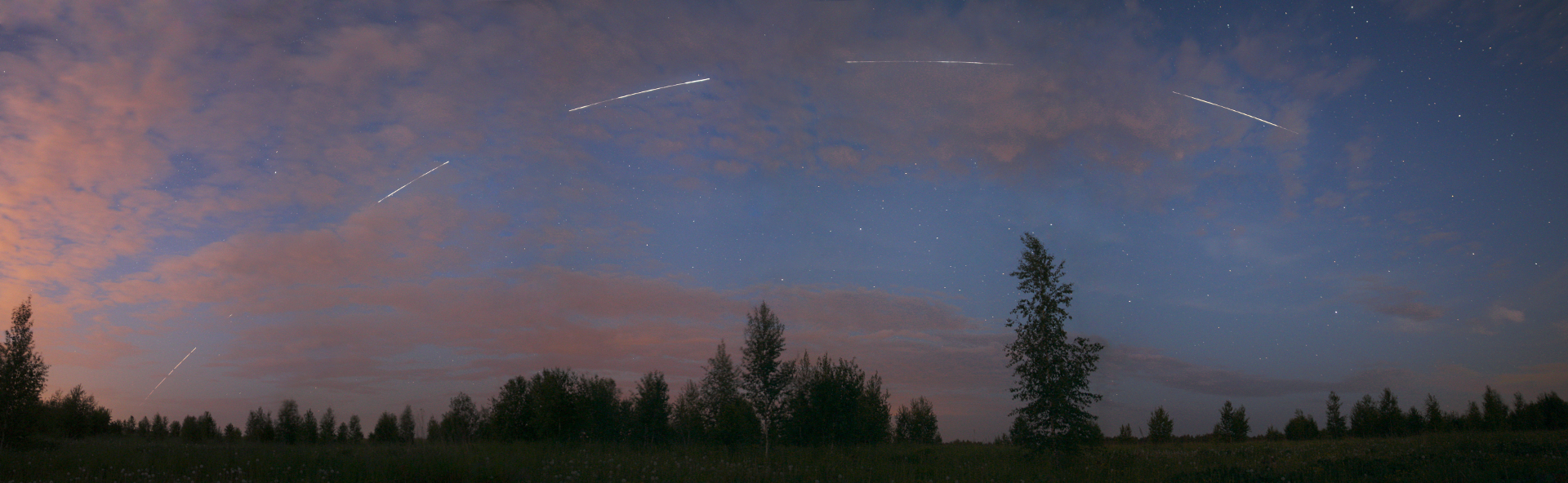 Пролет Международной космической станции 29 мая 2016 года, Нижегородская область. Во время пролета снял панораму. Большие разрывы в треке МКС соответствуют промежуткам между экспозициями, мелкие получились из-за облаков.