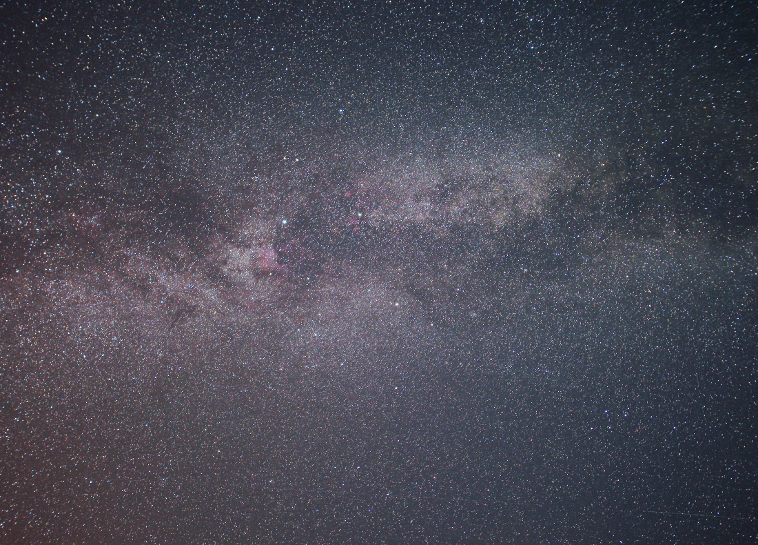 Летом на еще не слишком темном и, вдобавок, довольно засвеченном небе в 20 км от Нижнего Новгорода немного поснимал Млечный Путь - сделал 6 минутных кадров с ведением. И вот решил кое-как обработать отснятое. Материала мало, качество низкое, да и обработал не лучшим образом, но что-то да видно. Неплохо заметны водородные туманности - "марганцовочные" пятна на фоне Млечного Пути.