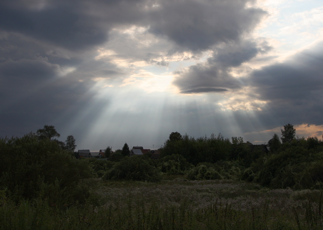 Лентикулярное облако и сумеречные лучи, 10 августа 2012, Нижегородская область. Для образования лентикулярных облаков нужны сильные восходящие потоки воздуха, поэтому они обычно образуются над горами и в наших краях очень редки.