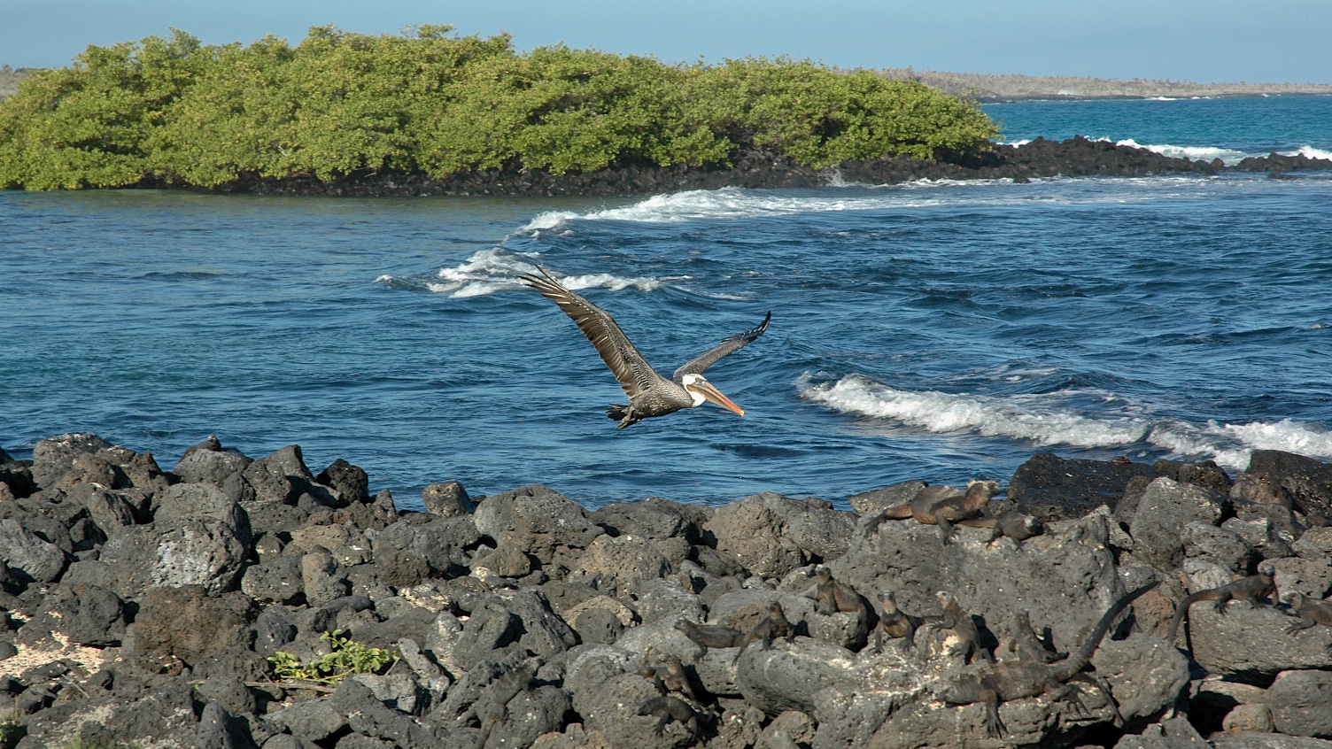 Типичная картина на побережье острова Санта-Крус: морские игуаны, расселись по скалам, а над водой кружит пеликан.