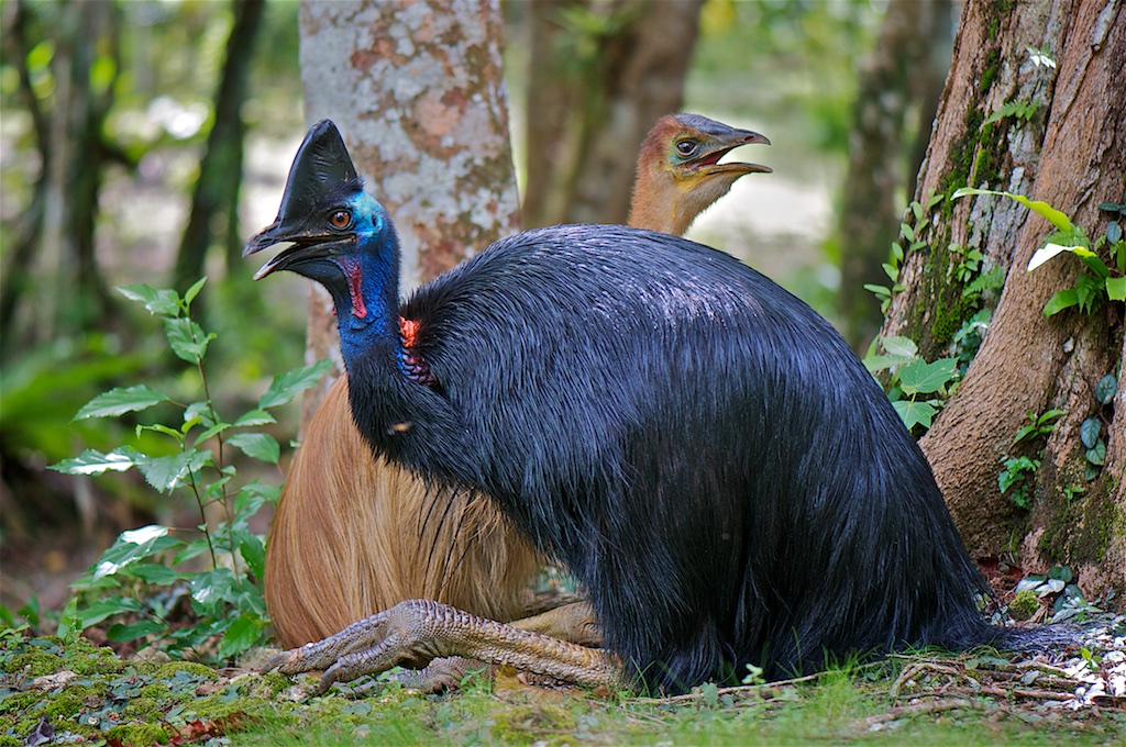 Шлемоносный казуар, на снимке самец со своим подросшим птенцом. У казуаров за птенцом ухаживают самцы примерно втечение года, после их рождения.
