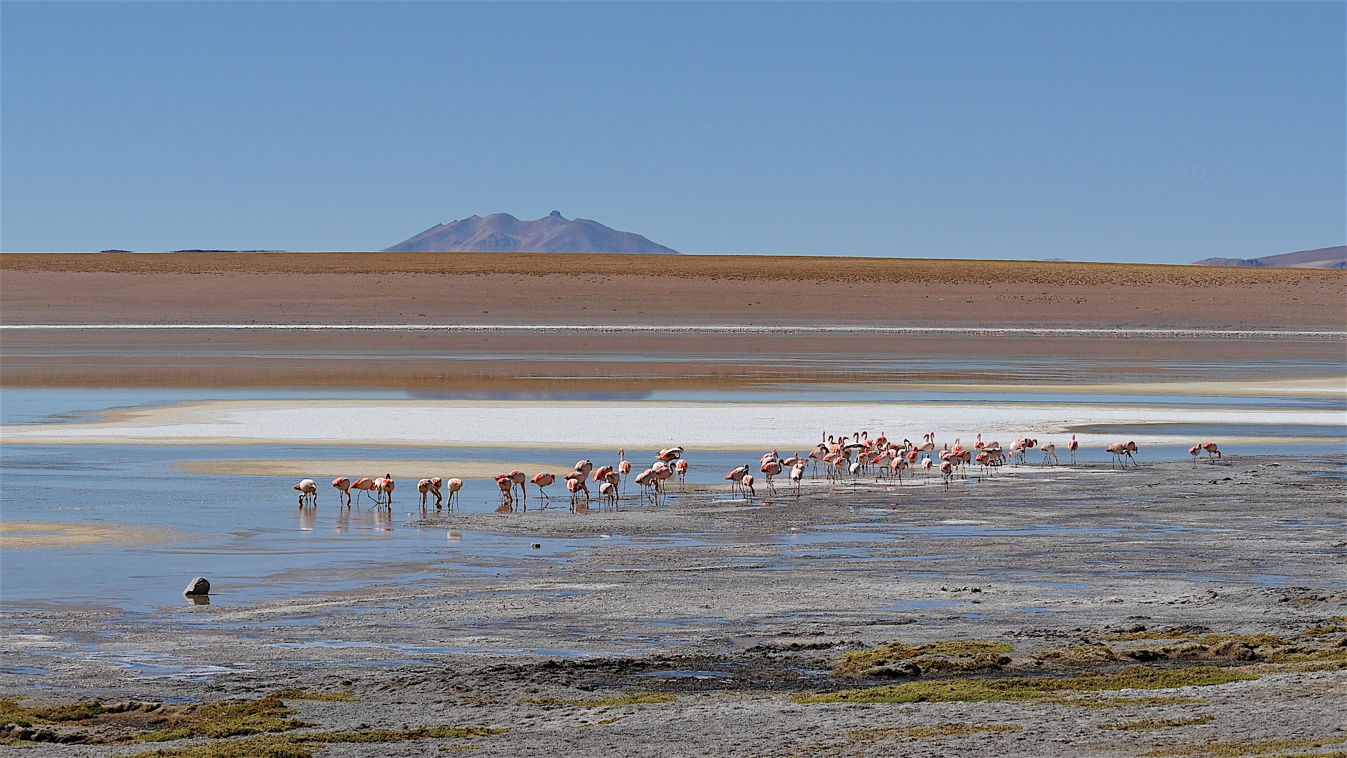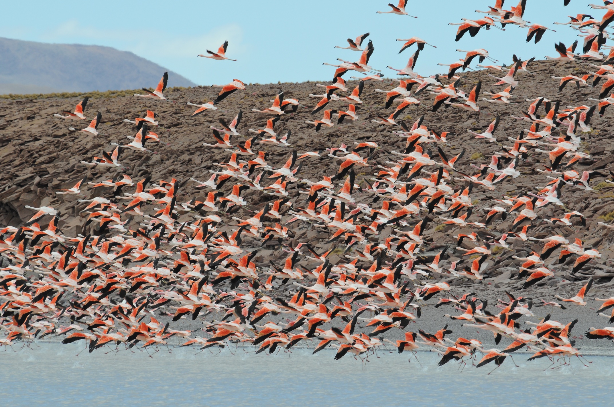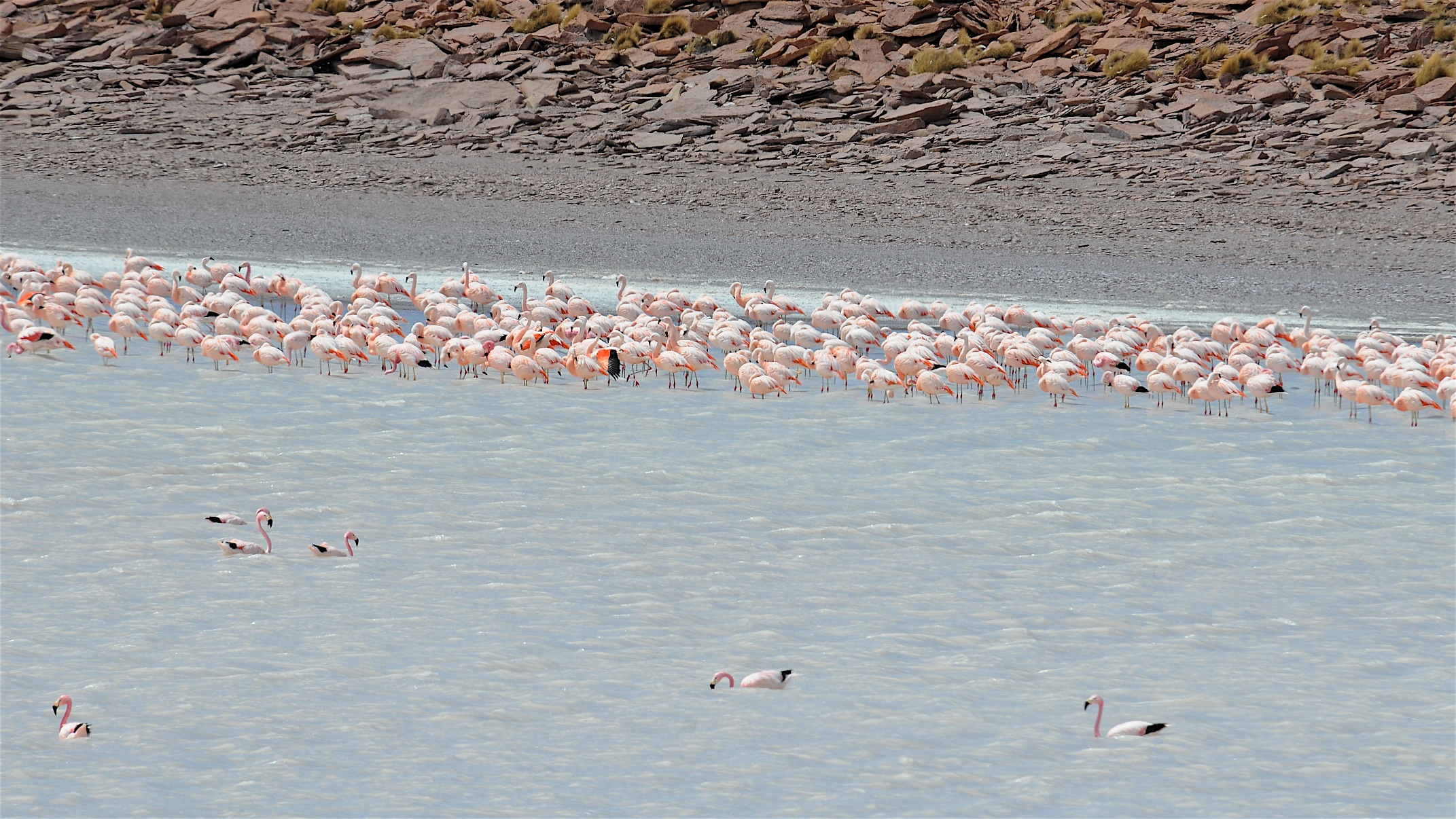 Полагаю, что на снимках Фламинго Джемса (Phoenicoparrus jamesi) — южноамериканский вид фламинго, обитающий на горных плато Анд в Перу, Боливии, Чили и Аргентине. Этот вид родственно связан с Андским фламинго, однако меньше его по размерам (около 90 см). У фламинго тонкие длинные ноги, гибкая шея и оперенье, окраска которого варьирует от белого до красного цвета. Их особым отличительным признаком является массивный выгнутый вниз клюв, с помощью которого они фильтруют пищу из воды или ила. В отличие от большинства других птиц, подвижной частью клюва у фламинго является не нижняя, а верхняя часть. Передние пальцы ноги соединены плавательной перепонкой. Розовую или красную окраску оперению фламинго придают красящие вещества липохромы, которые птицы получают вместе с пищей. В ходе нашего путешествия фламинго встречались на озерах с различной окраской воды: красной, белой и даже зеленой.