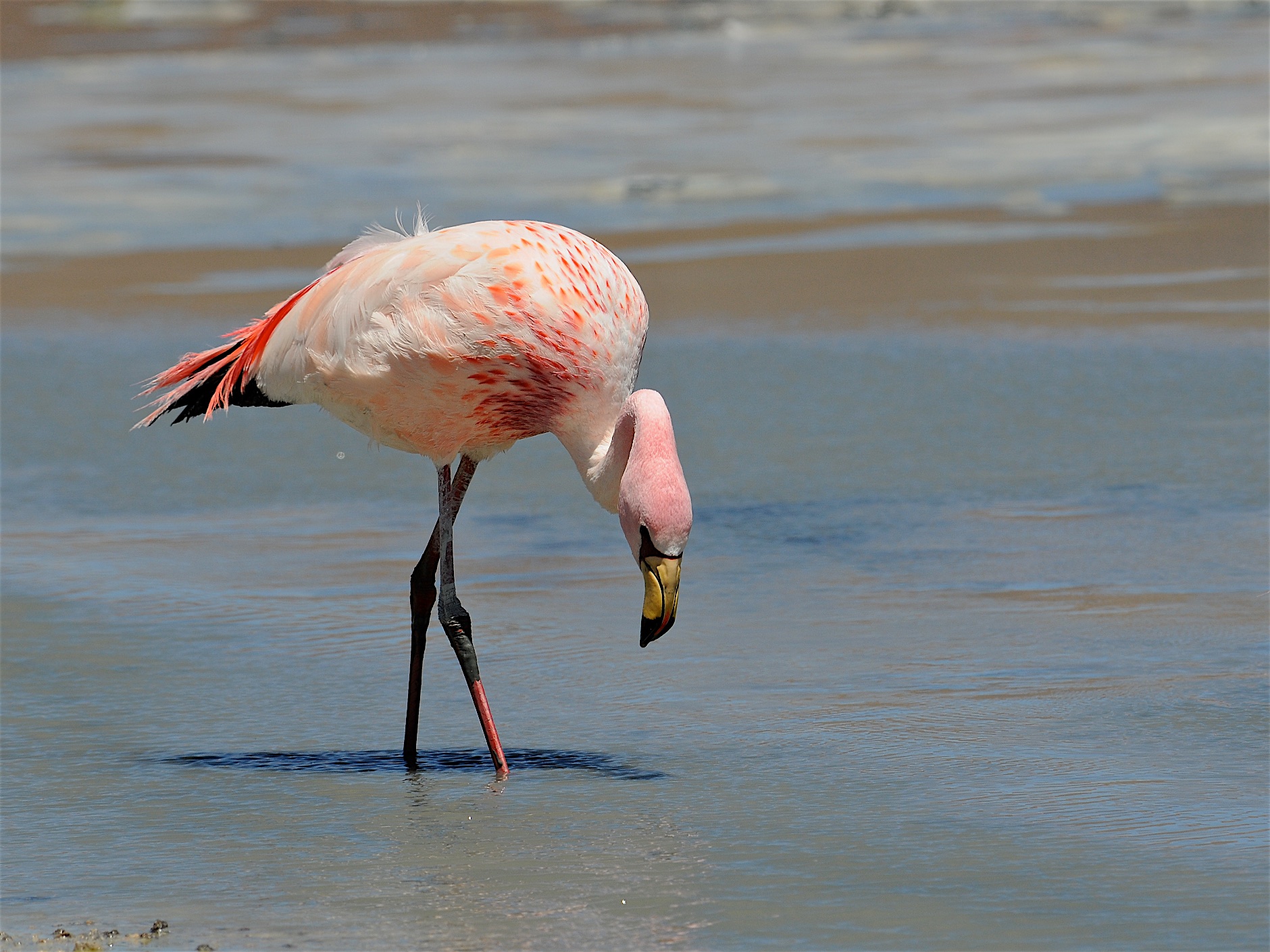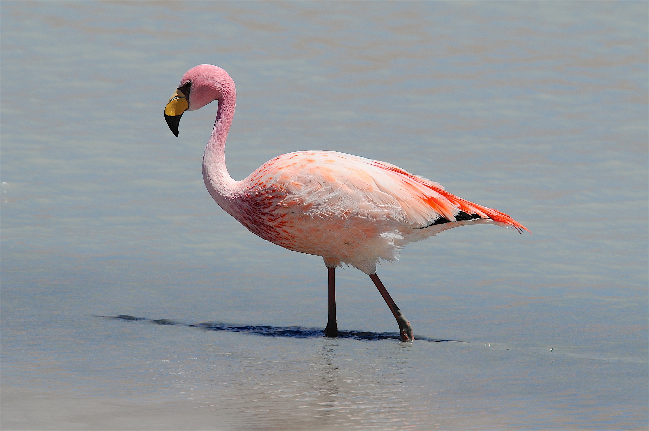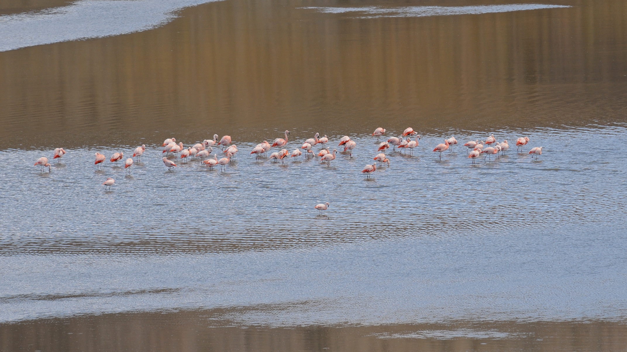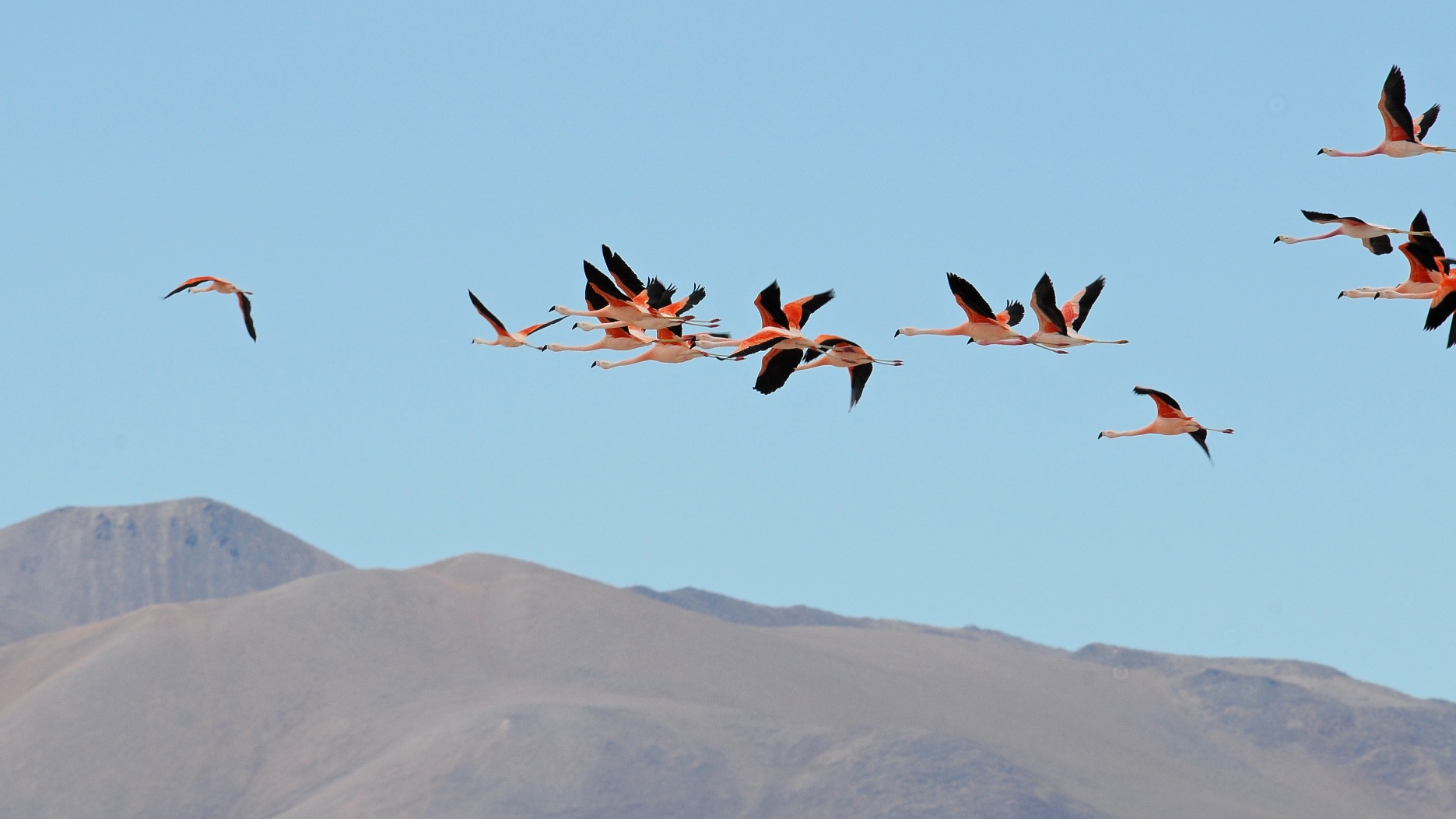 Полагаю, что на снимках Фламинго Джемса (Phoenicoparrus jamesi) — южноамериканский вид фламинго, обитающий на горных плато Анд в Перу, Боливии, Чили и Аргентине. Этот вид родственно связан с Андским фламинго, однако меньше его по размерам (около 90 см). У фламинго тонкие длинные ноги, гибкая шея и оперенье, окраска которого варьирует от белого до красного цвета. Их особым отличительным признаком является массивный выгнутый вниз клюв, с помощью которого они фильтруют пищу из воды или ила. В отличие от большинства других птиц, подвижной частью клюва у фламинго является не нижняя, а верхняя часть. Передние пальцы ноги соединены плавательной перепонкой. Розовую или красную окраску оперению фламинго придают красящие вещества липохромы, которые птицы получают вместе с пищей. В ходе нашего путешествия фламинго встречались на озерах с различной окраской воды: красной, белой и даже зеленой.
