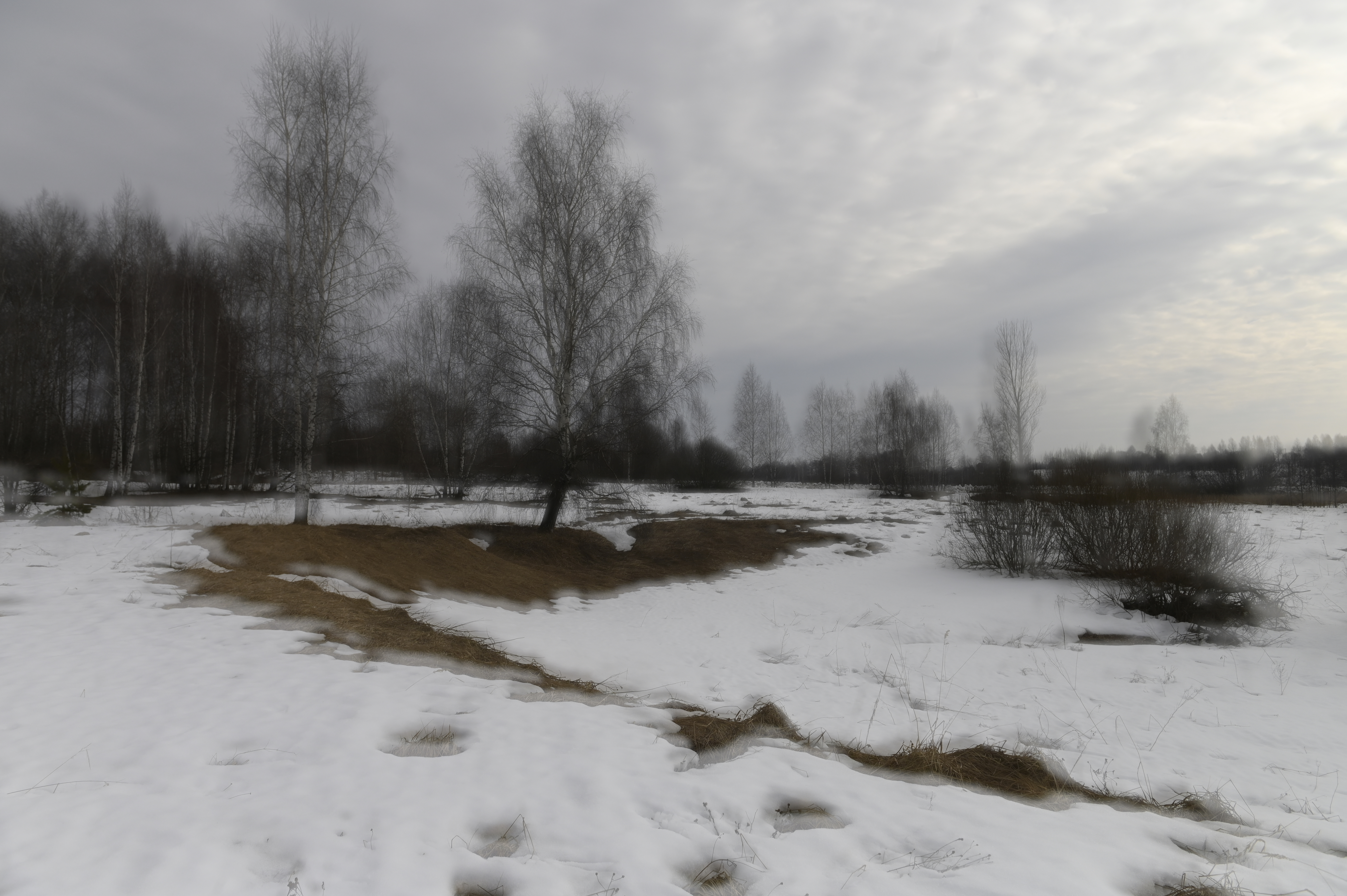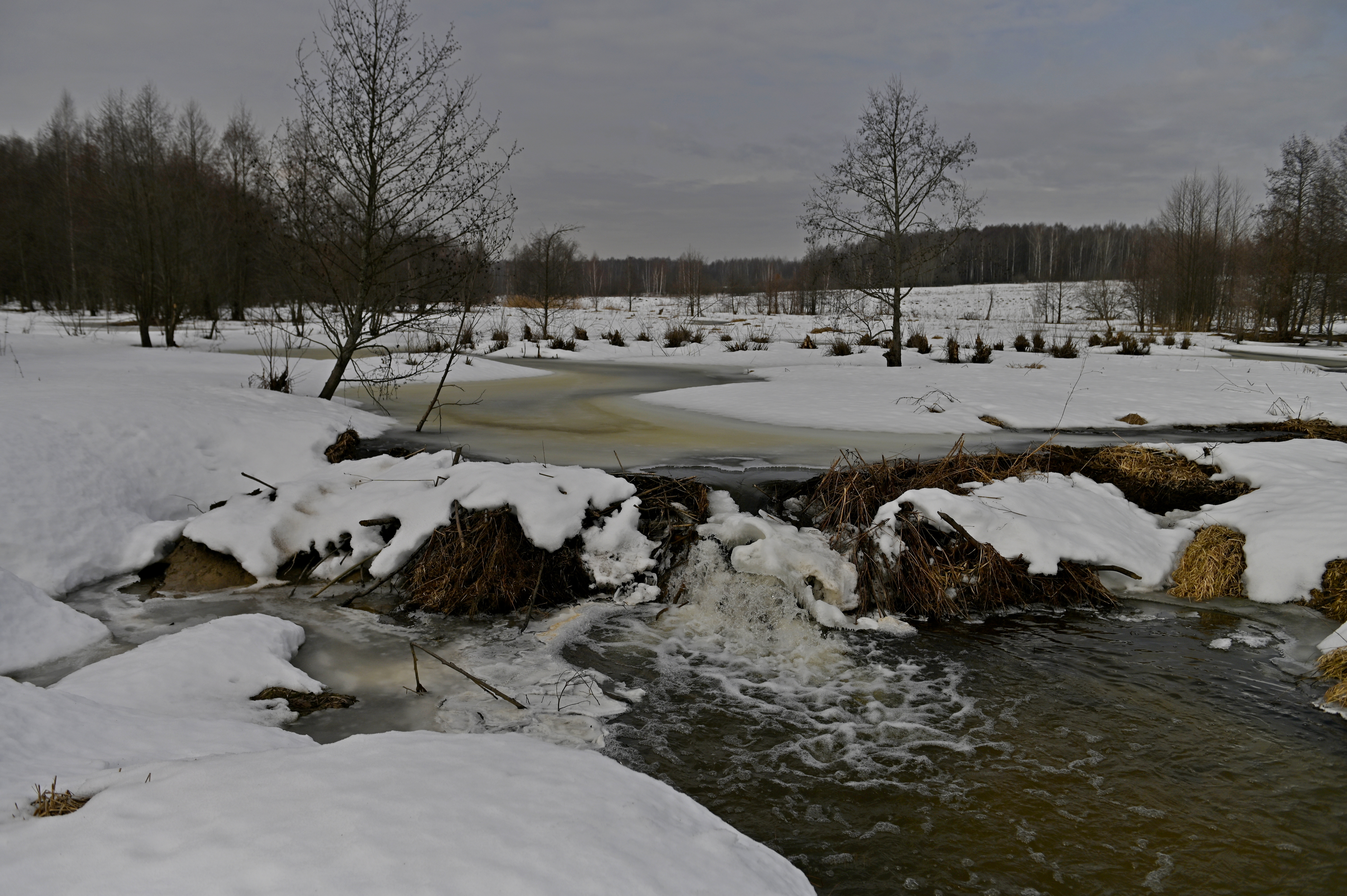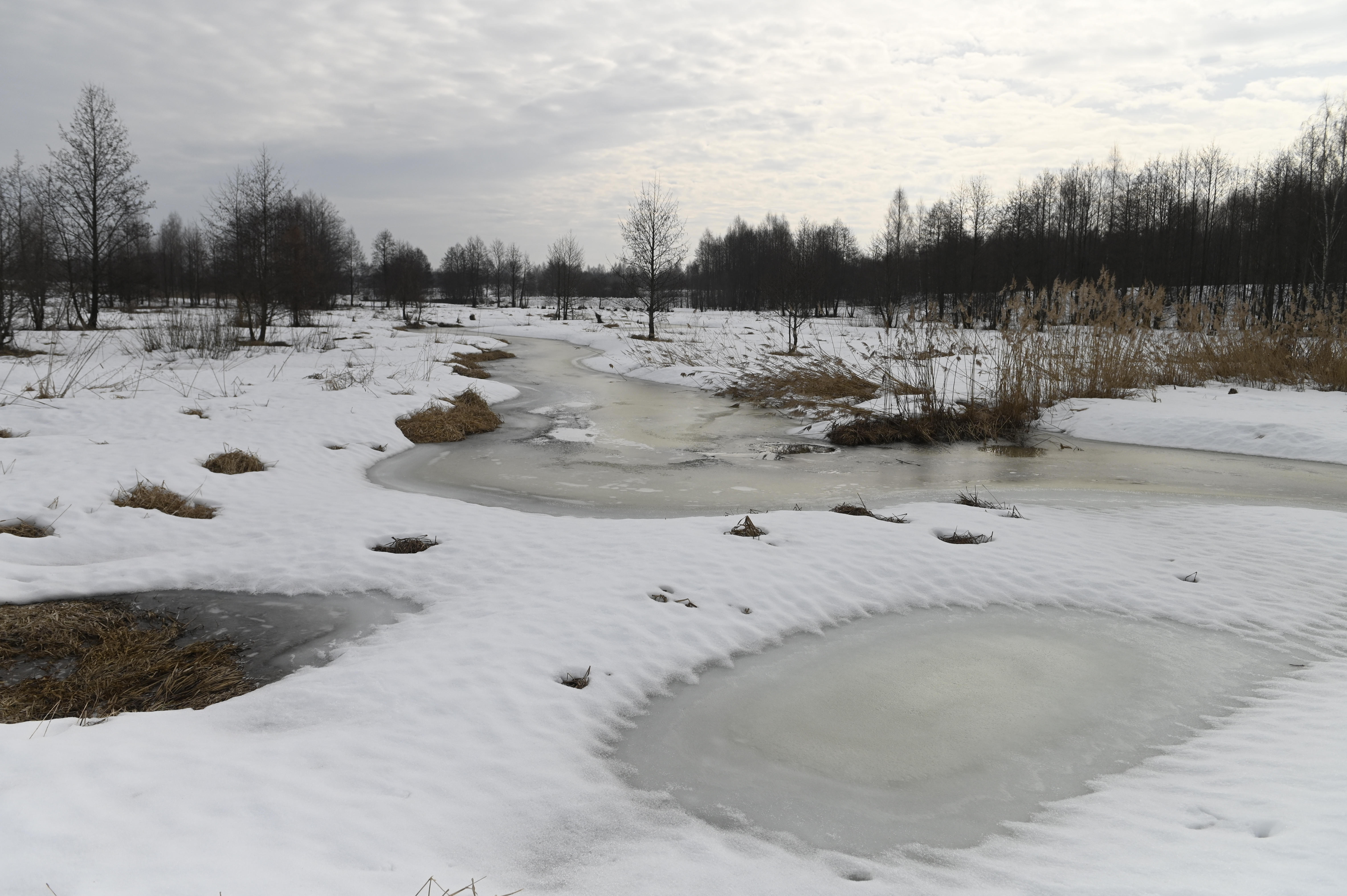 После оттепели и ночного мороза наст держит хорошо и решил отправится на открытые просторы на обход окрестных угодий вниз по течению Раменки в поля. следов тетеревиных токов не нашел. только помет. А так- красивые поля с разливами, бобровая плотина. Нашел несколько лисих нор, вырытых в дренажных отвалах.