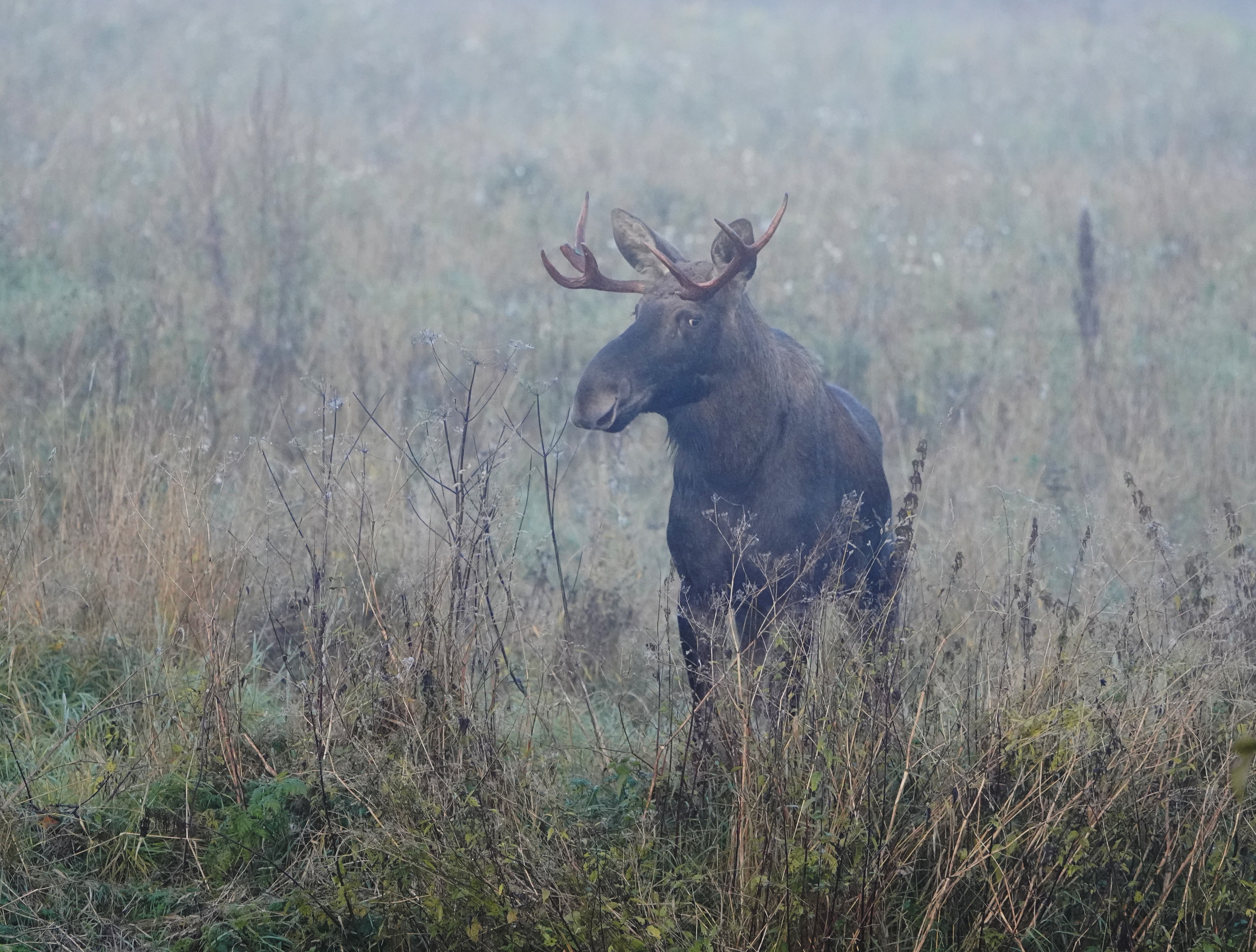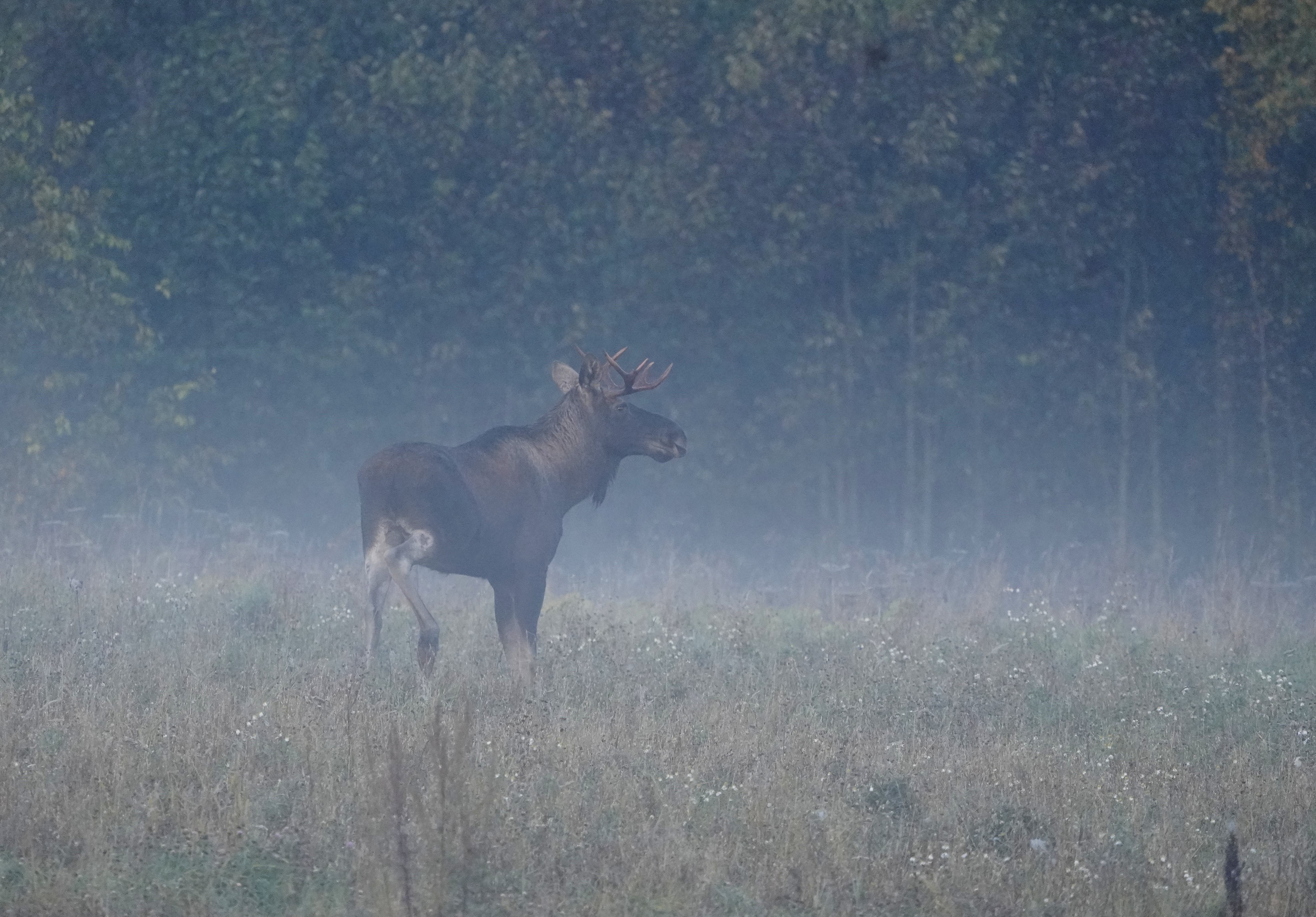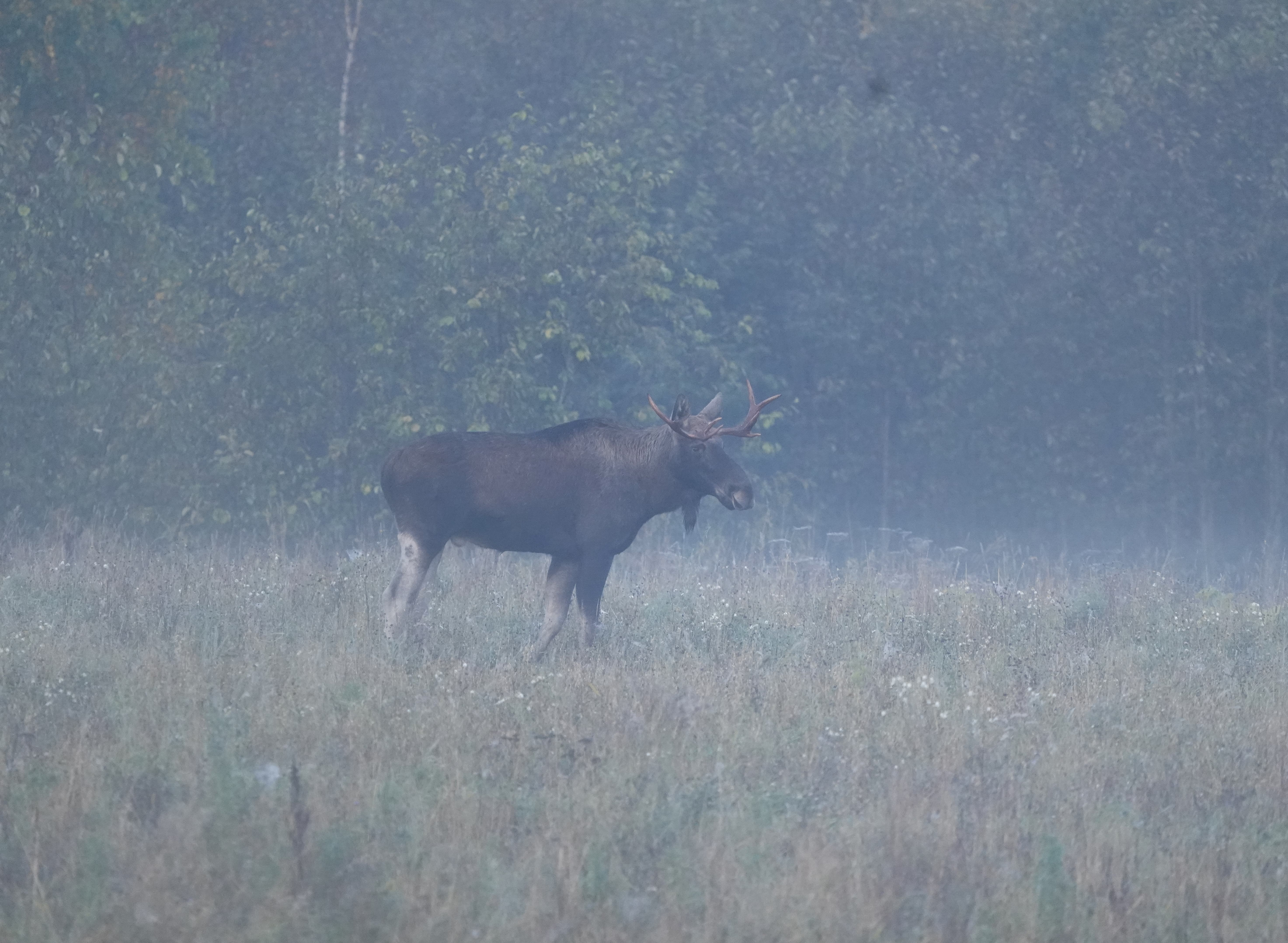 Спустя неделю встреча с лосем во время гона всё же состоялась. Процесс фотографирования был долгий и начался еще затемно. Первый заход был неудачным - мы разошлись встречными курсами, причем лось почуял мой запах и "залаяв" ушел в лес. Я его увидел на входе в лес, но снять не смог. Но терпение преодолело всё. Я понял, что зря пытался увидеть его в мелколесье и перешел на другую сторону и вышел на большую поляну по другую сторонуречки и стал ждать. И вот раздались уже знакомые "охи" или "кваканье", кому как нравится, и бык в туманной дымке нарисовался на поляне по другую сторону русла Дубца. Долго он на меня смотрел пока я на наживал параметры камеры, но потом решил, что вот его счастье и он видит лосиху и двинулся ко мне, плотоядно облизываясь и охая по дороге. Я понял что у меня уже не одна задача- снять лося на гону, но и другая не менее важная- не быть жестоко изнасилованным вместо отсутствующей лосихи. Несмотря на все трудности обе задачи (особенно вторая) удались!